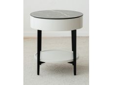 Bedside table composed of a metal structure in matte black, ceramic top in white and gray tones and body made of ash wood in matte sand gray colorDimensions in cmL 45 D 45 H 49.5Delivery time 15 to 20 days