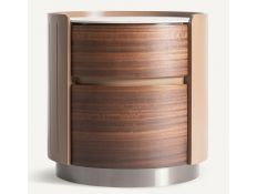 Modern bedside table with a natural walnut veneer structure, upholstered in cowhide and an original stainless steel base, offering ample storage space with two drawers with handle opening and soft closingDimensions in cmL 50 D 42 H 46Delivery time10 to 20 days