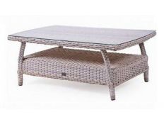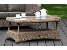 Coffee table in rattan, with glass top for outdoor use.Dimensions in cmL 120 D 70 H 45Delivery time20 to 30 days