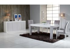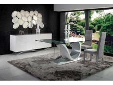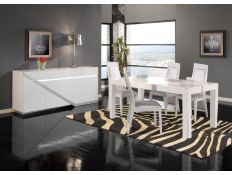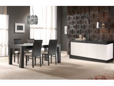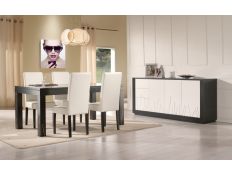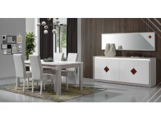 Dimensions in cmsSideboard L 210 H 90 D 50Extending table L 180 / 280 H 78 D 100 (Extensible 50 + 50)ChairL 50 H 107 D 61 Finish just like the picture: Lacquered in white and gray metallic Delivery time: 30 a 40 days