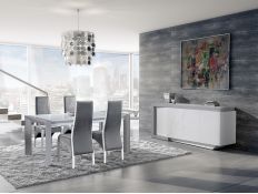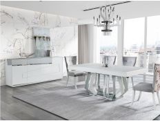 Delivery time:30 a 40 daysDimensions in cmsSideboardL 210 H 90 D 50Extendable Dining TableL 180/280 H 78 D 100 (extension +50 +50)ChairL 50 H 90 D 50Finishing just like the picture: Matt white lacquered with metallic gray lacquered details
