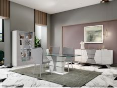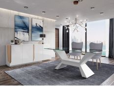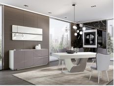 Delivery time:30 a 40 daysDimensions in cmsSideboardL 210 H 65 D 50Dining TableL 180 H 78 D 100 ShowcaseL 120 H 200 D 47ChairL 50 H 90 D 55Finishing just like the picture: White lacquered matt with details in gray lacquered matt