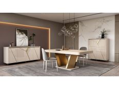 Delivery time:30 a 45 daysDimensions in cmsSidboardL 210 H 90 D 50Extendable dining tableL 200+50 H 79 D 110ChairL 50 H 89 D 50Bar cabinetL 120 H 133 D 45Finish just like the picture: Light beige lacquered L1013 + details in golden stainless steel