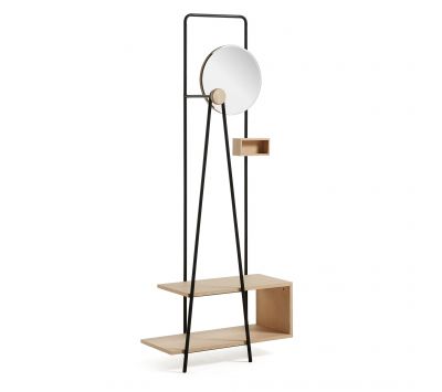Round mirror hanger, with black metal frame and oak veneer MDF shelves