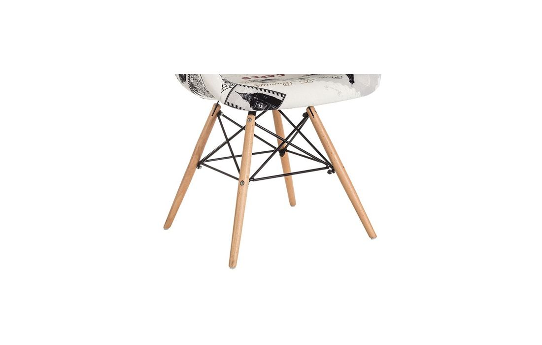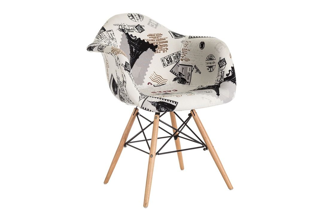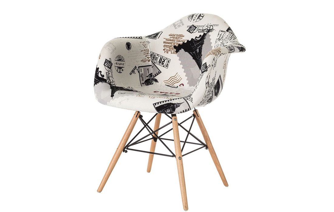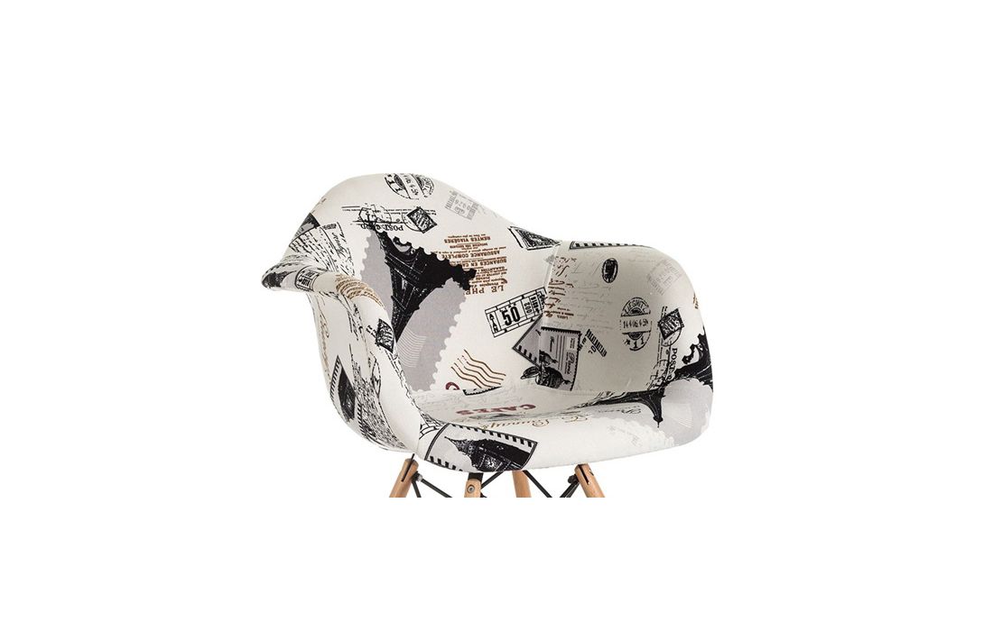 Armchair with seat covered in Parisian fabric and feet in solid beech wood with metal detailing.