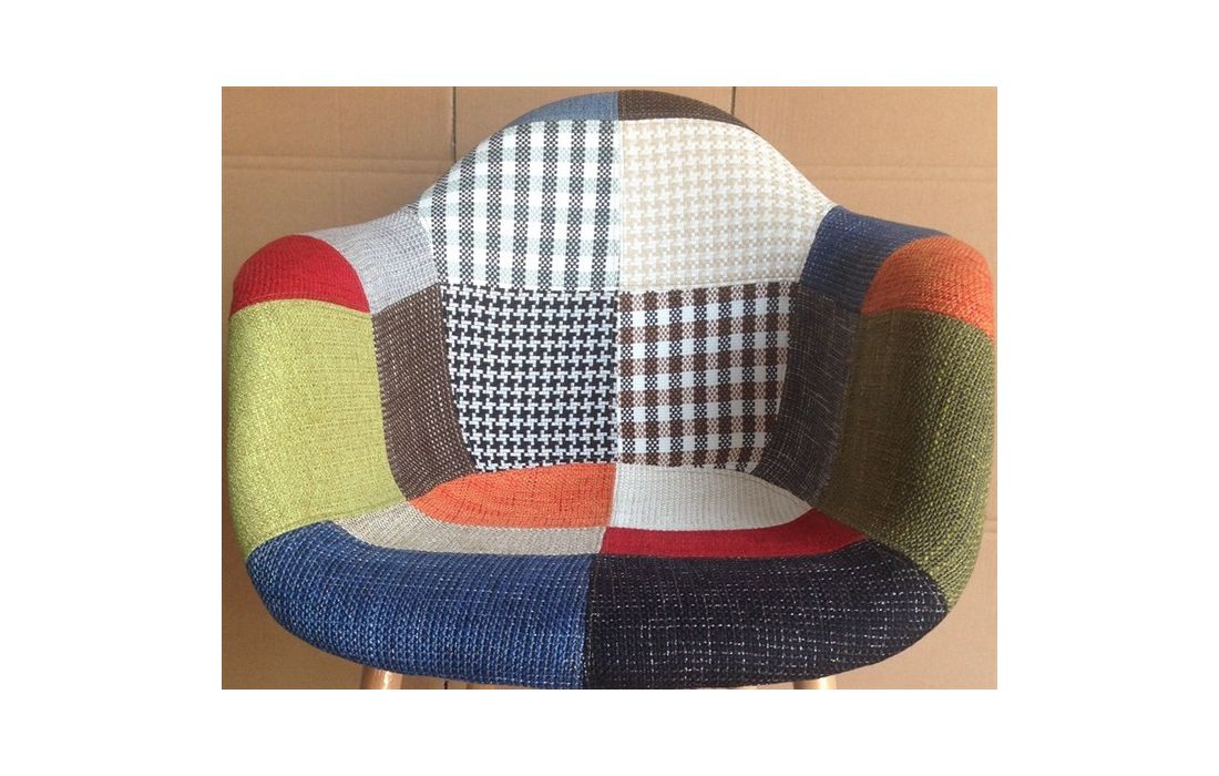 Armchair with seat covered in patchwork fabric and feet in solid beech wood with metal detailing.