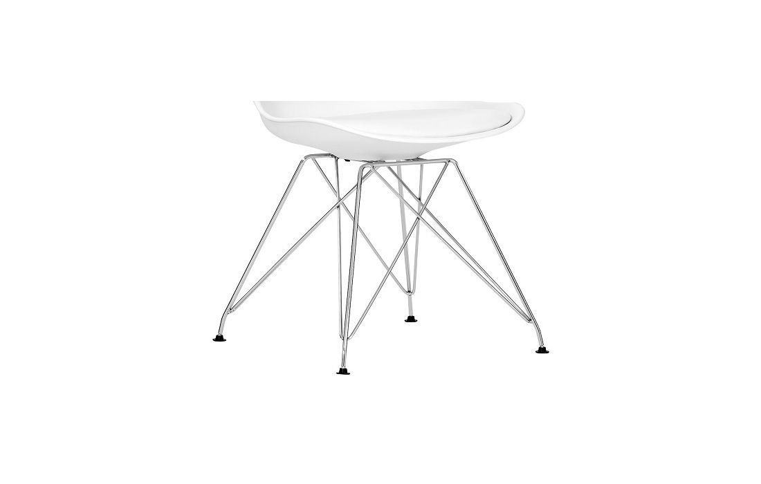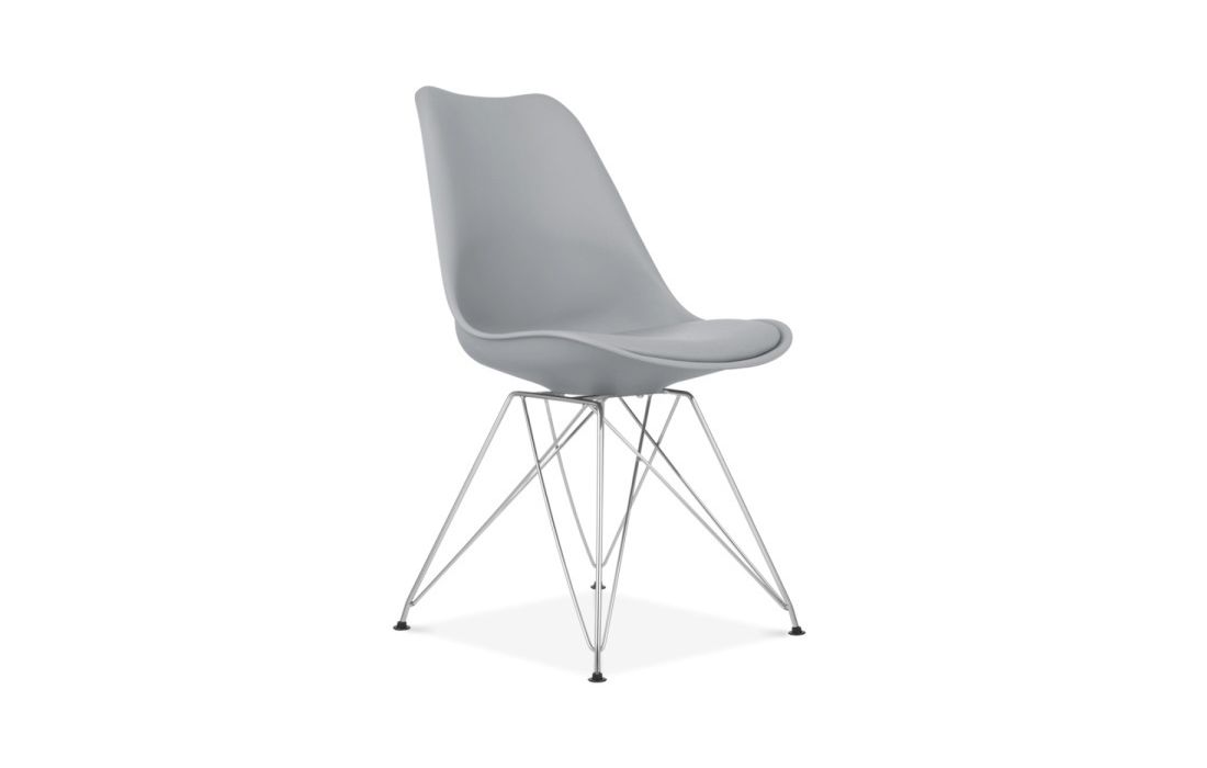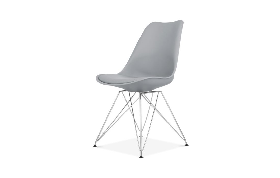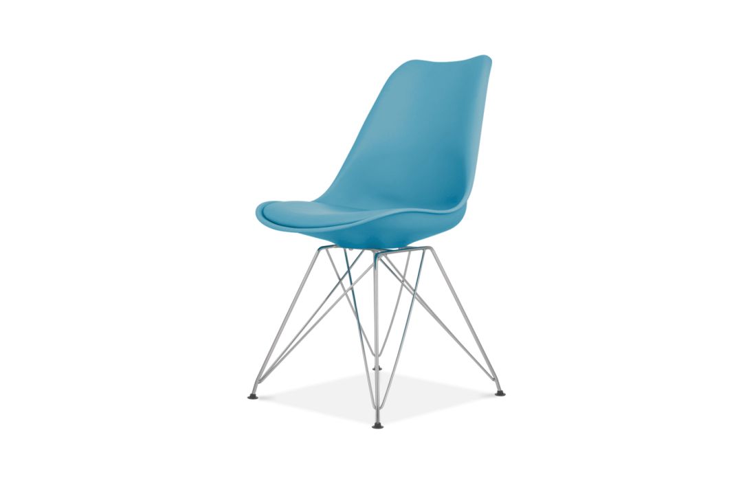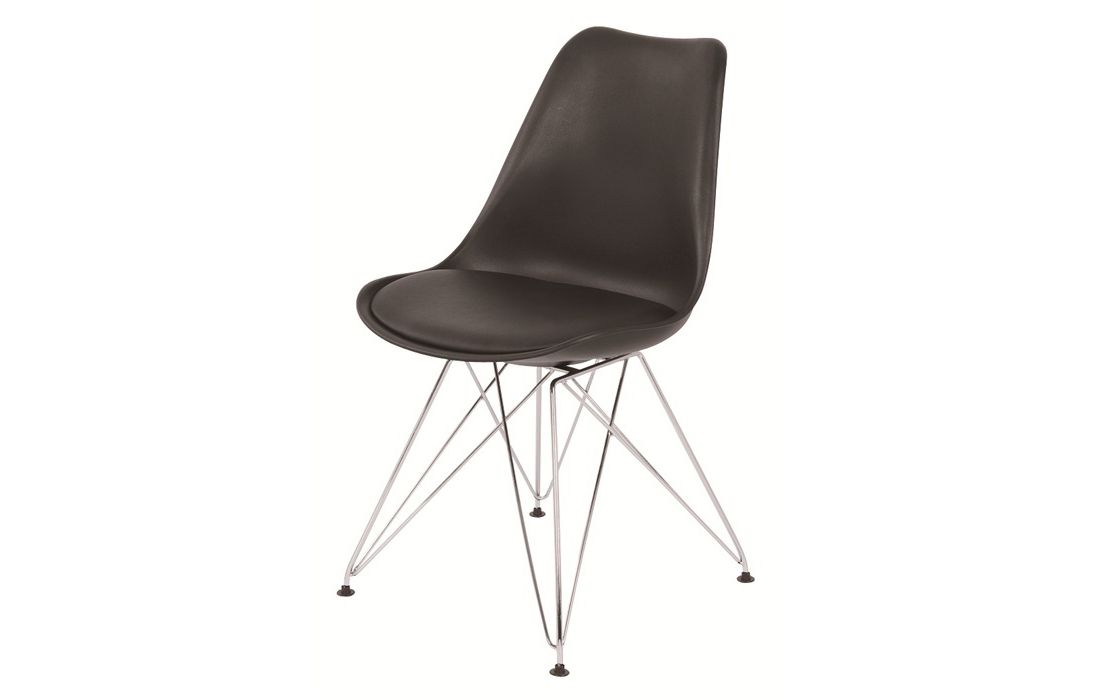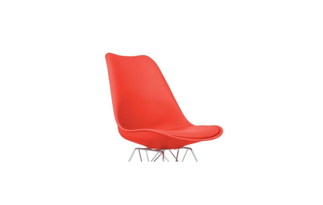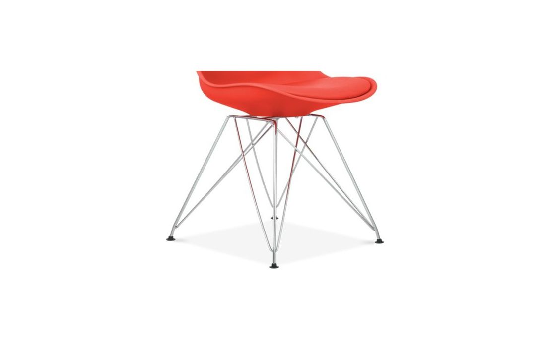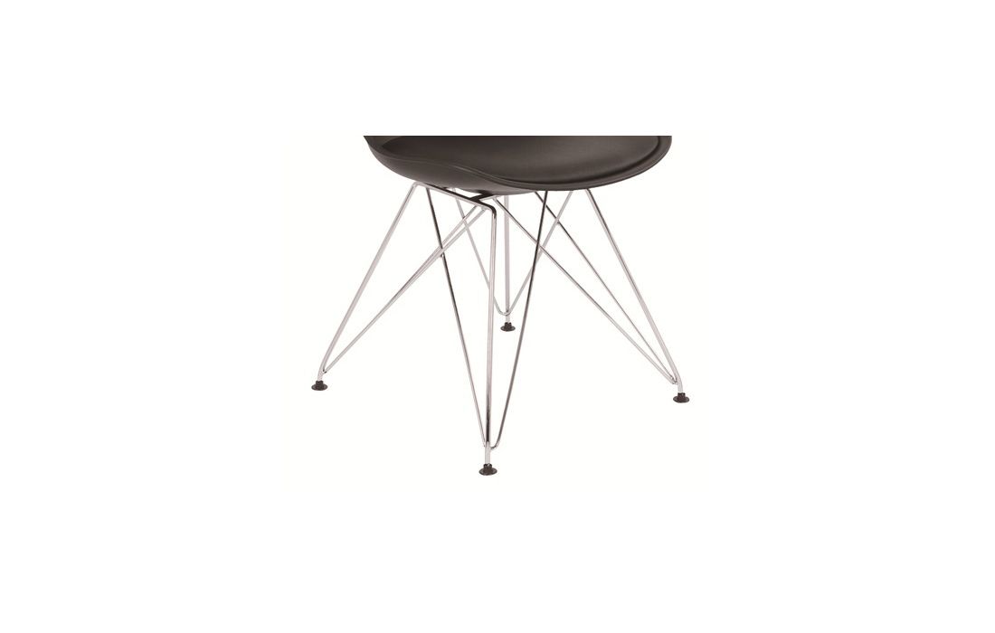 Chair with structure in chromed metal, seat in synthetic leather and coast in polypropylene of color blue, white, black, gray, orange or red.