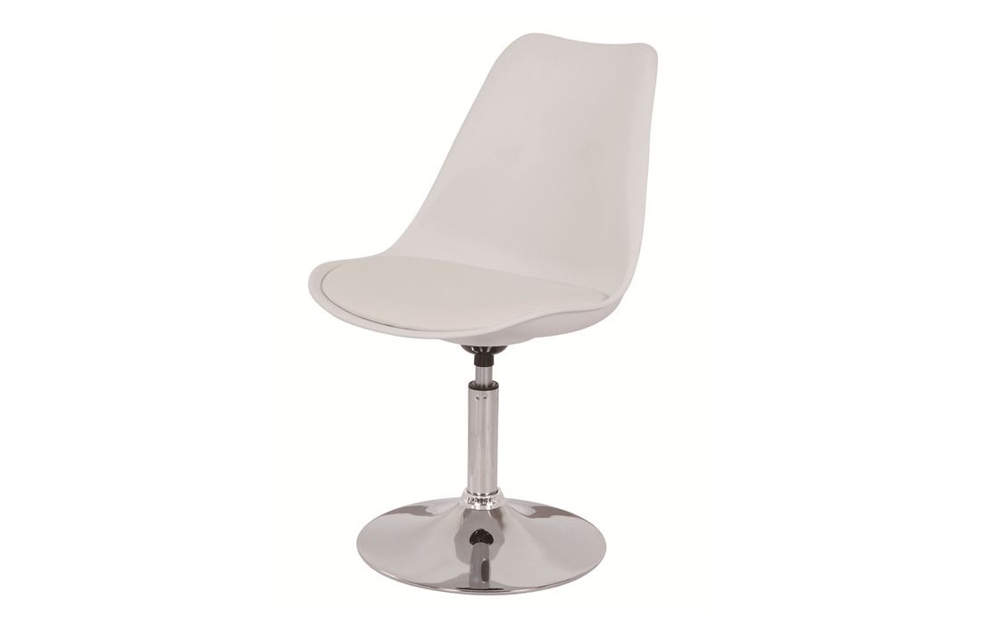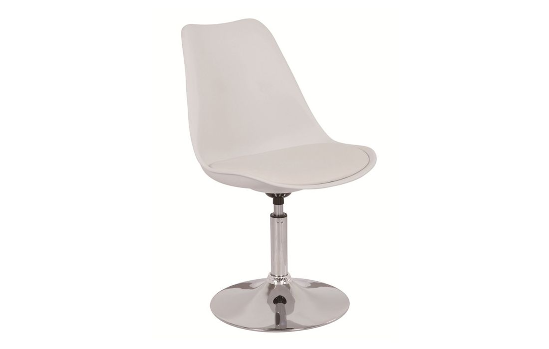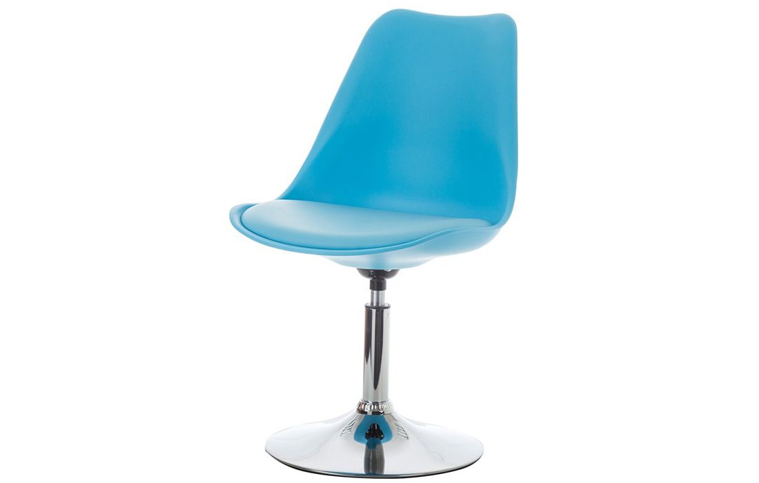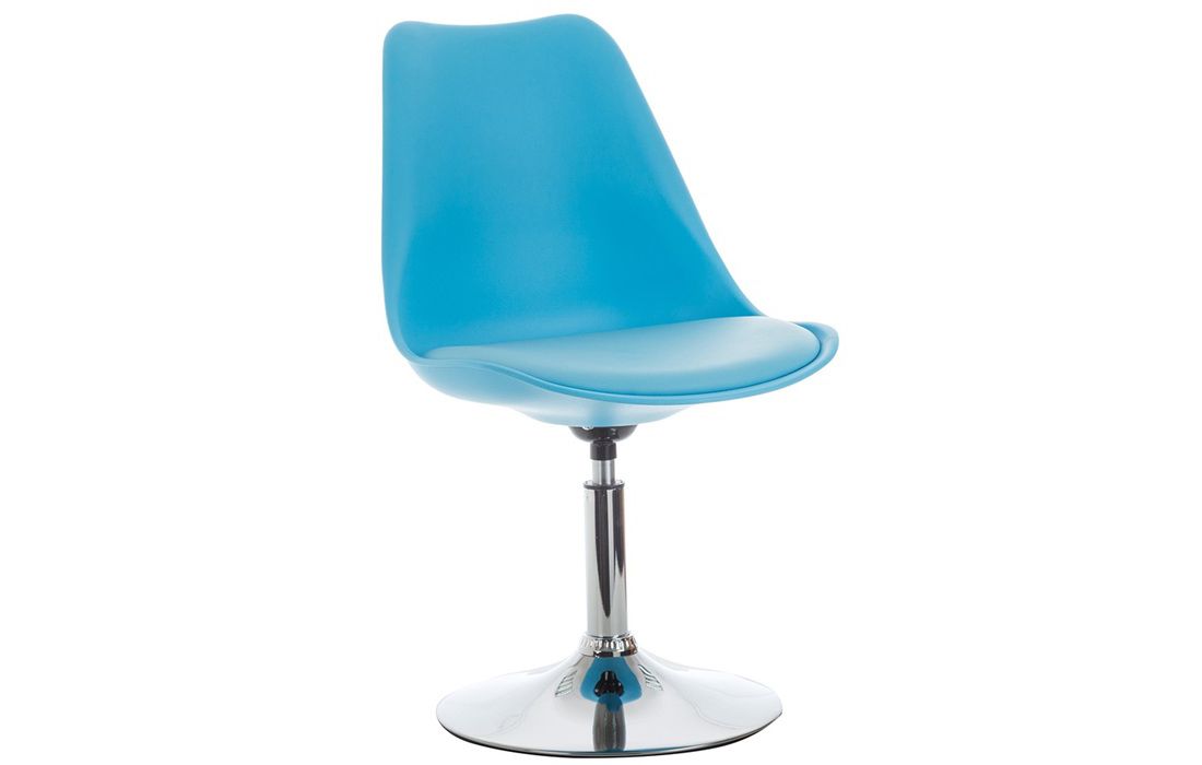 Swivel chair with chromed metal frame, synthetic leather seat and blue or white polypropylene strand.