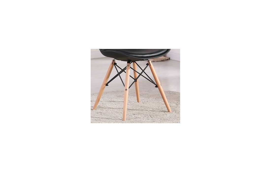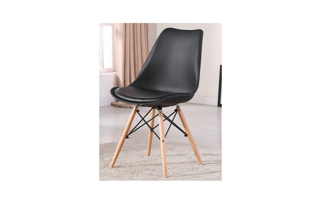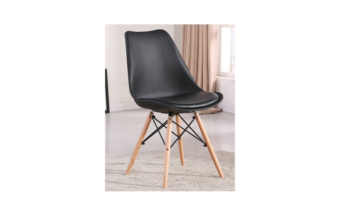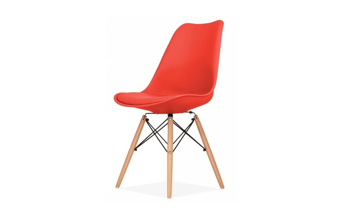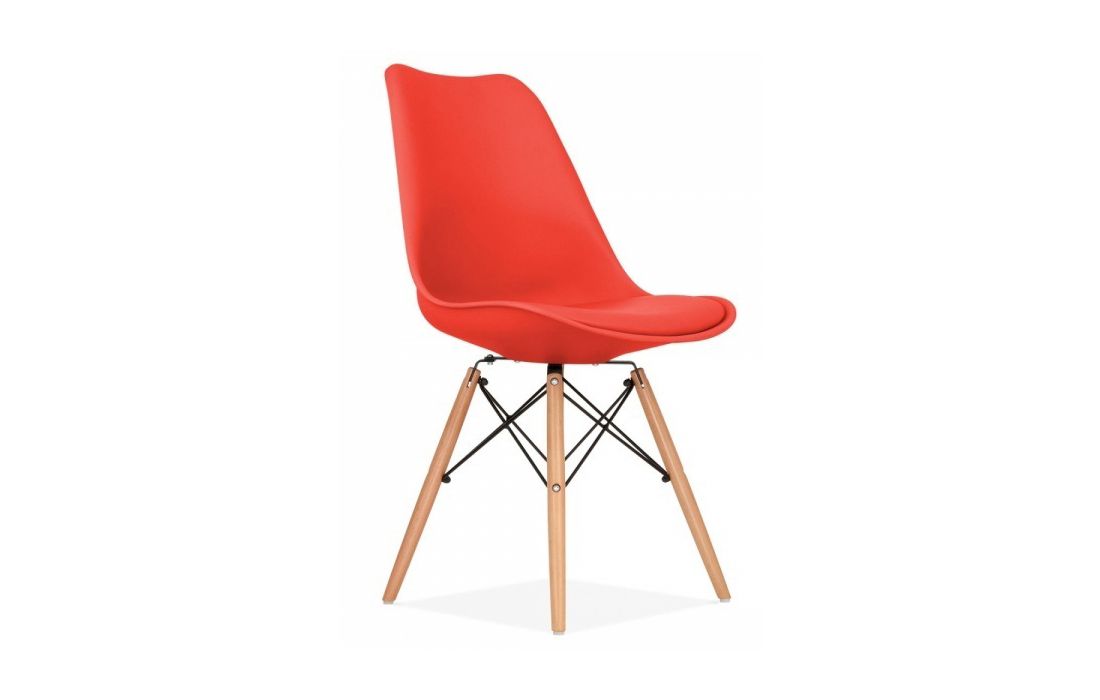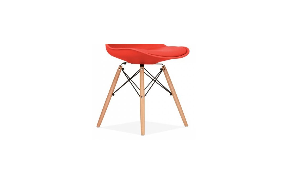 Chair with structure in polypropylene, seat in synthetic leather of orange, white, black or red color, feet in solid beech wood with metal detail.