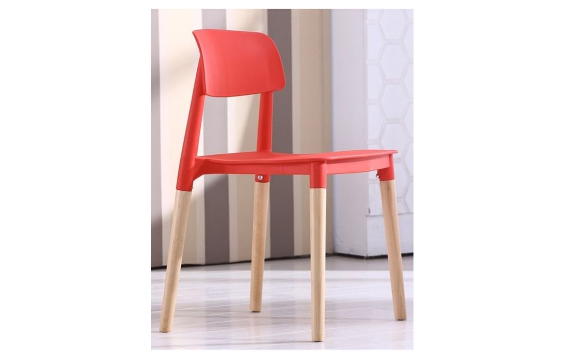 Chair with structure in polypropylene, seat in synthetic leather of white, black or red color, feet in solid beech wood.