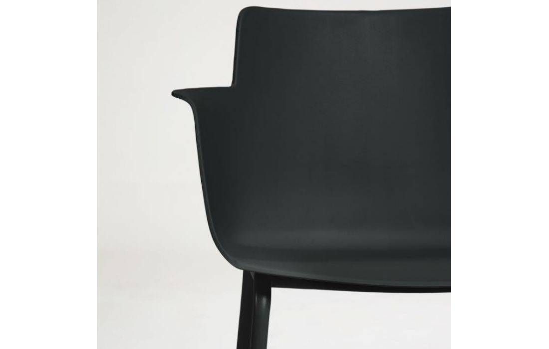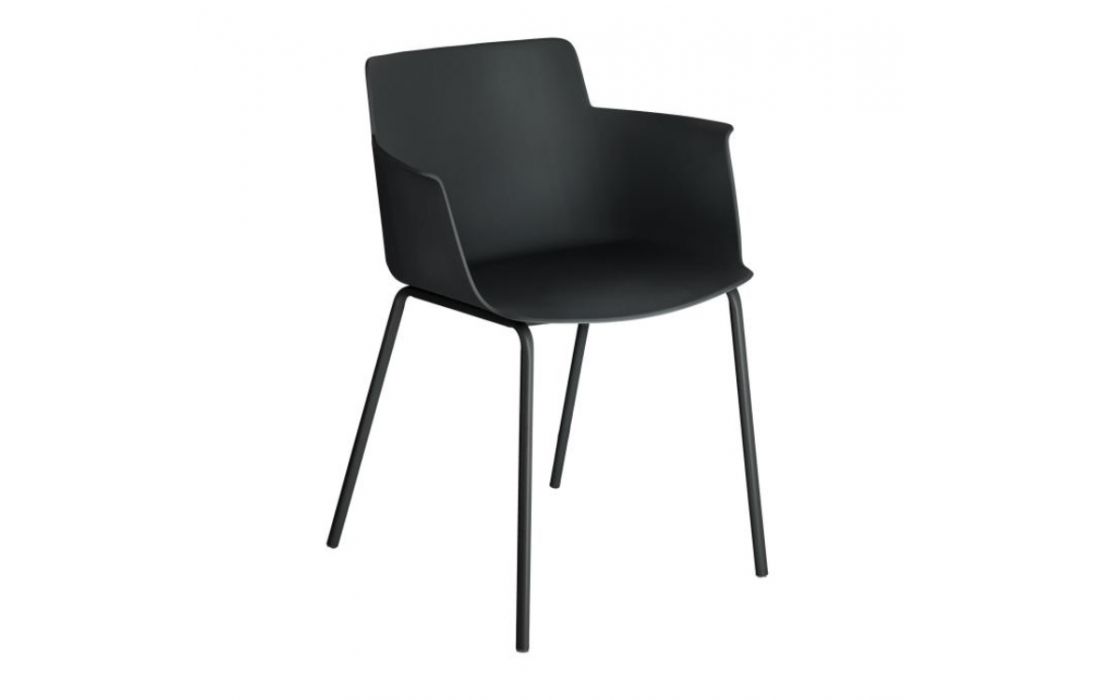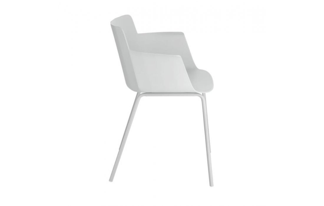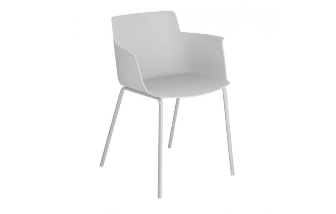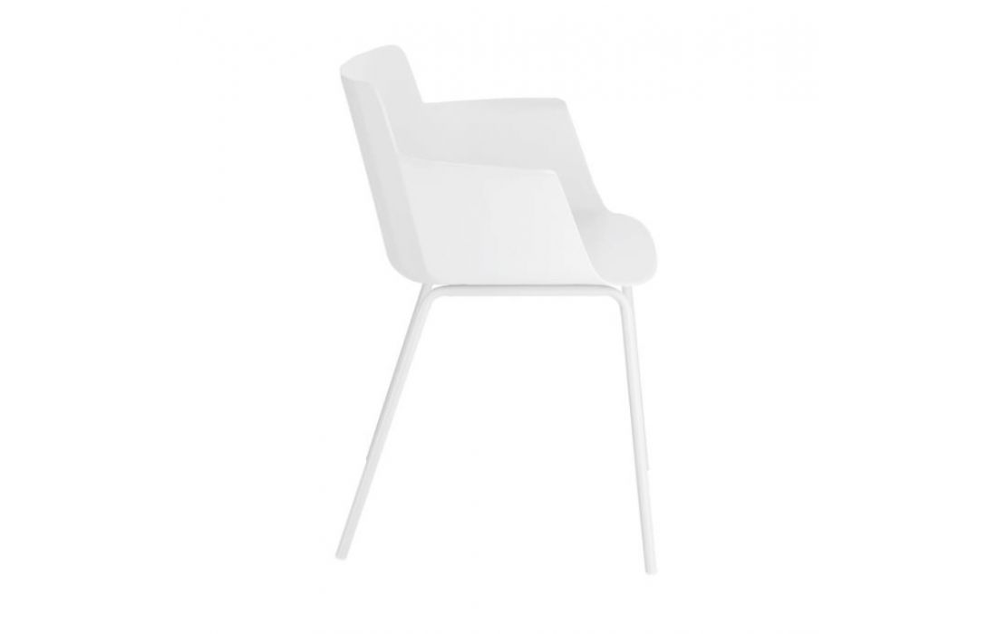 Chair w/ arms in polypropylene with steel legs. Available in multiple colors.