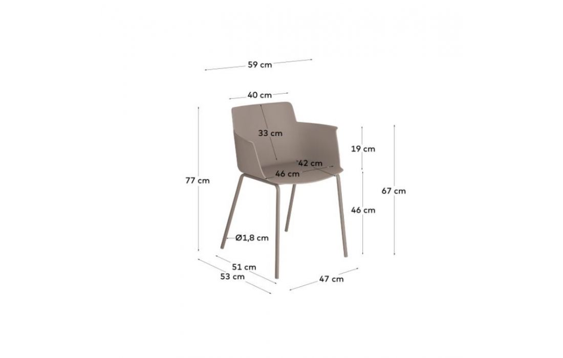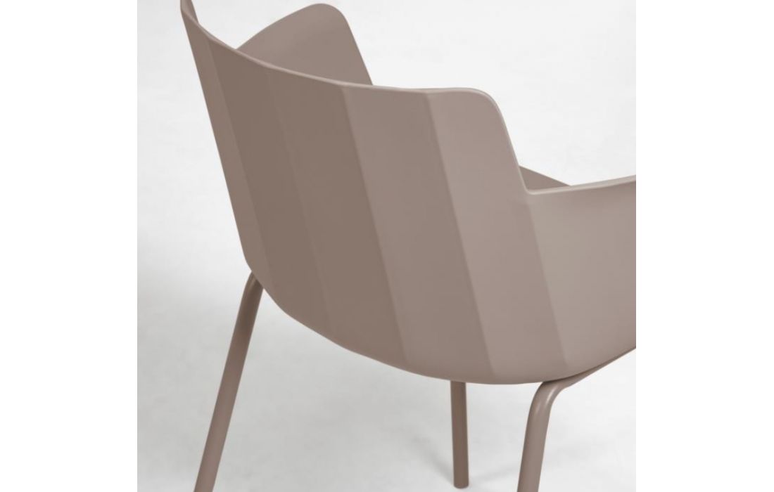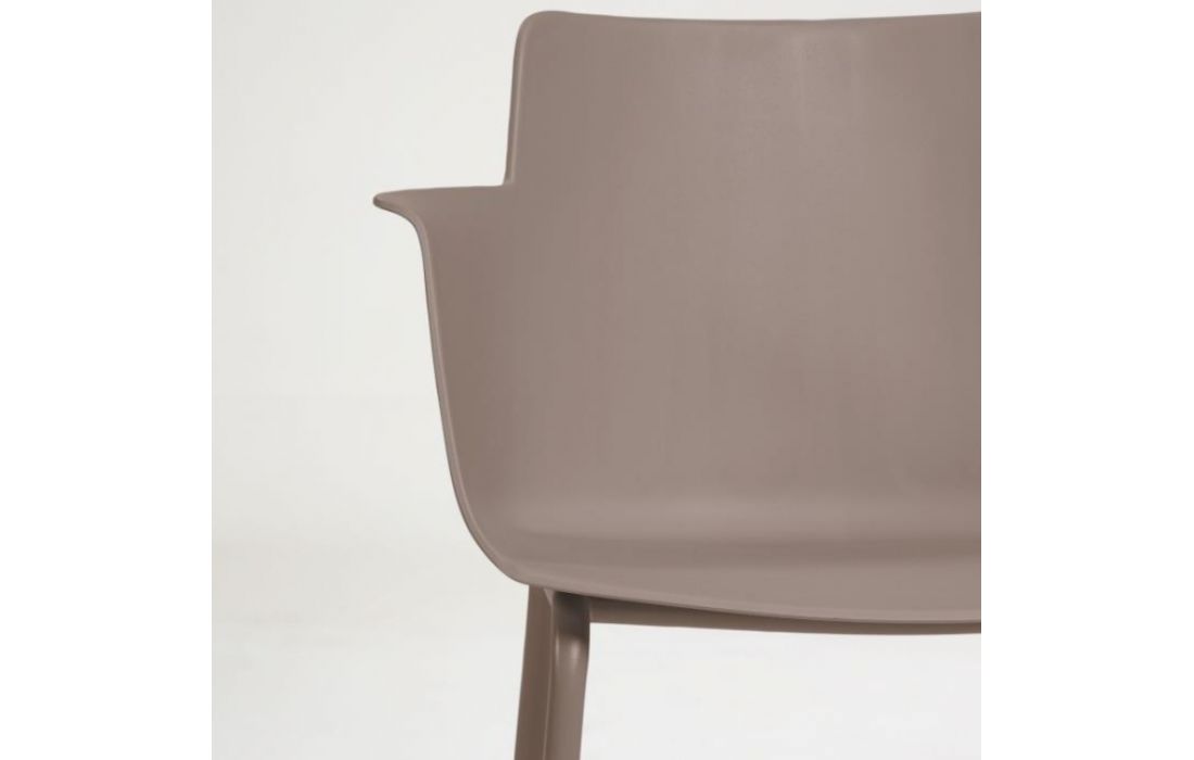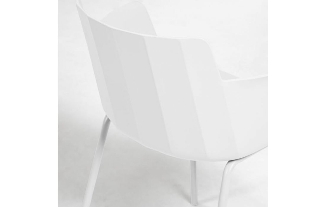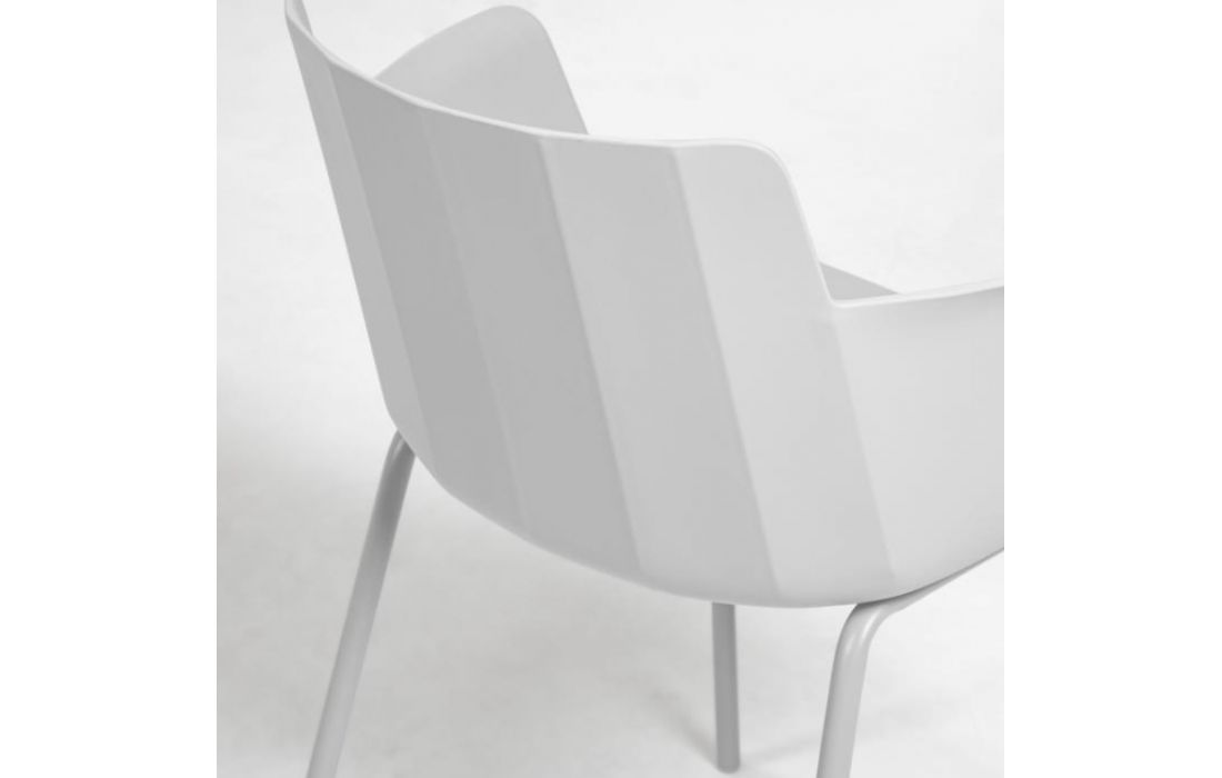 Chair w/ arms in polypropylene with steel legs. Available in multiple colors.