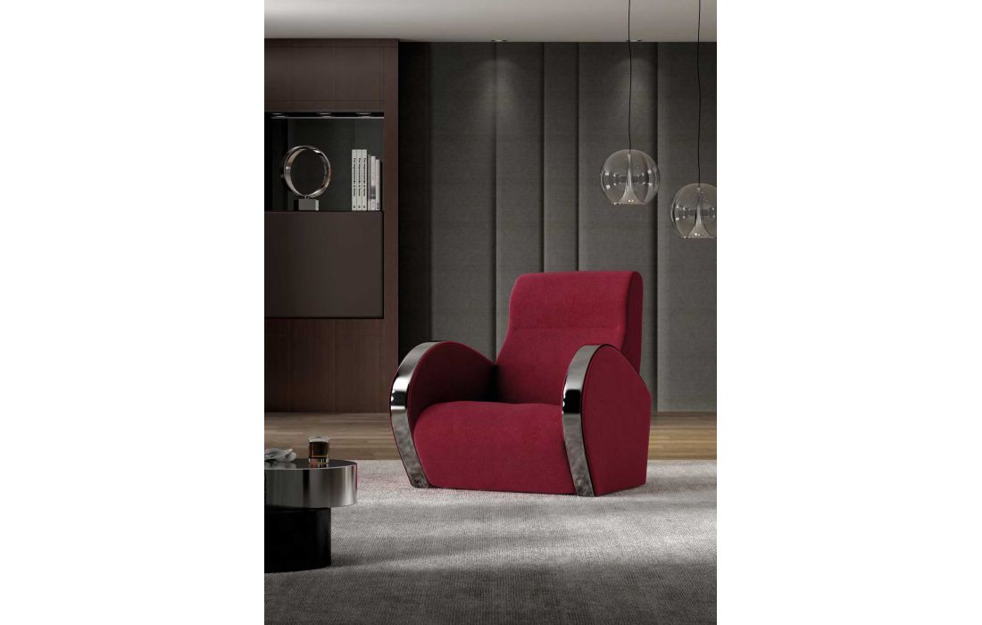 Armchair in various possible coatings, with detail of arms in metal.