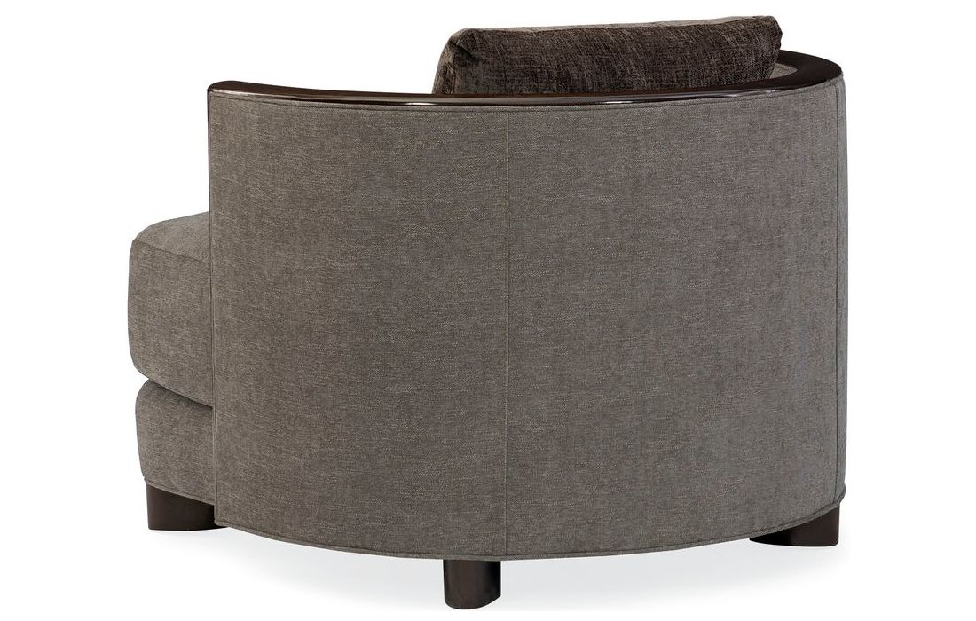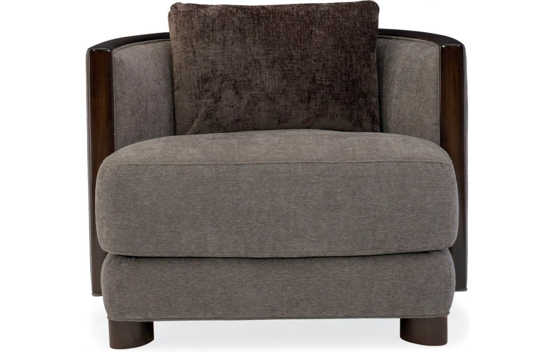 Erodomoc is an armchair with an imposing presence. This piece shows an aerodynamic design with its generously curved shape and the blend of wood and upholstery. Fully upholstered in soft knit fabric with a loose pillow topped with a luxurious espresso