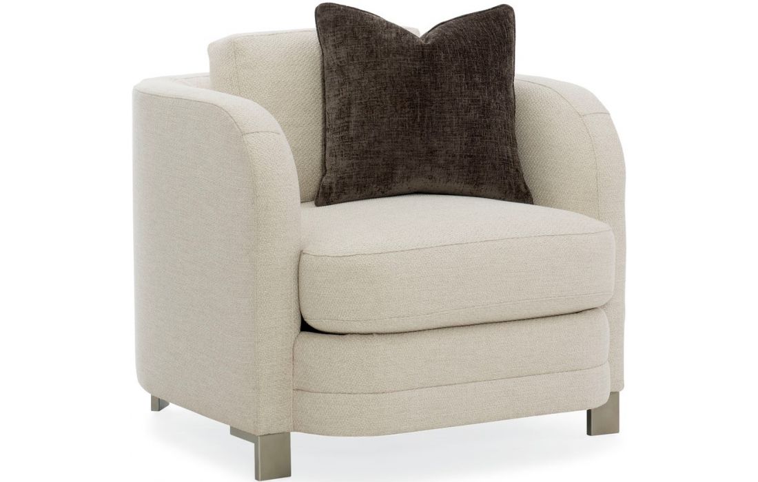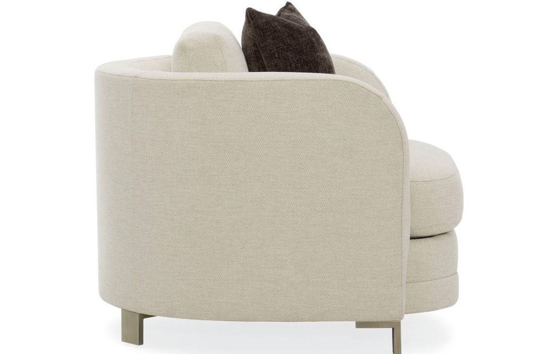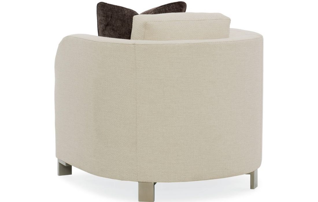 This elegant, low and modern armchair with a curvilinear appeal, fully upholstered in fabric. Refined and curved is accompanied by a soft "chenille plush" pillow. The piece is finished with bronze bronze metal feet