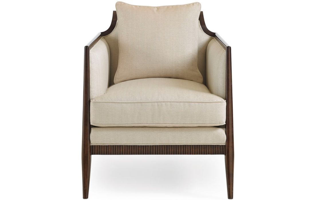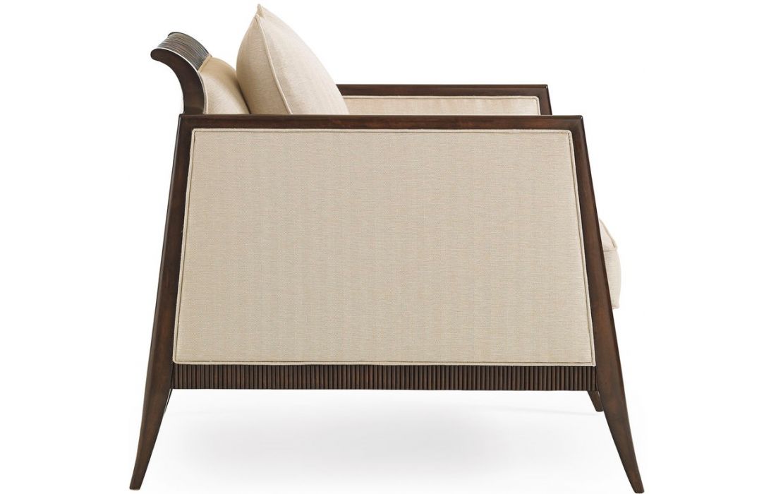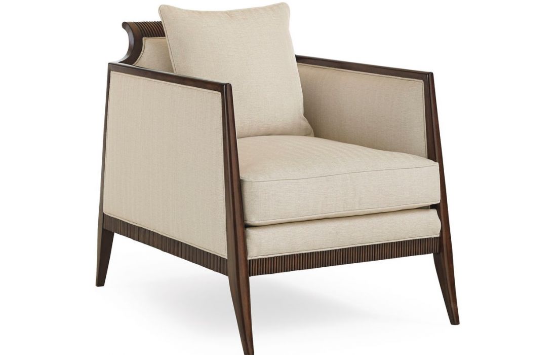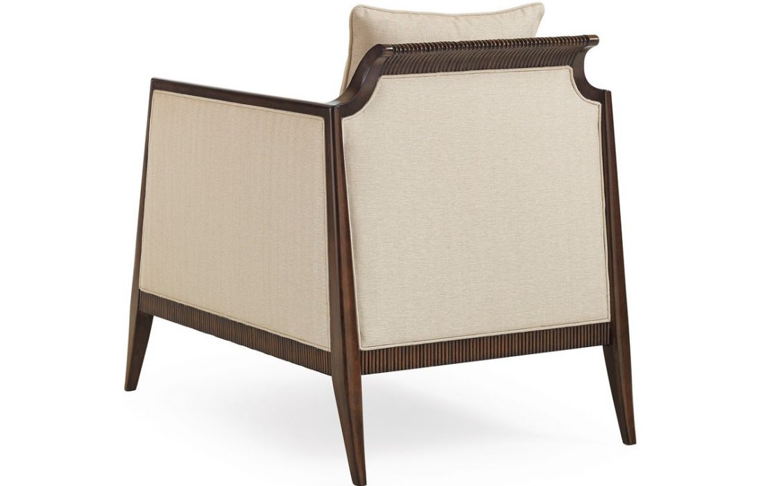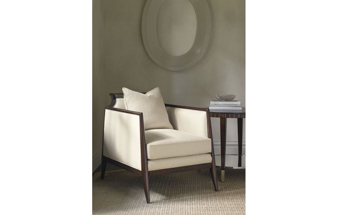 Luxury relaxed home. The stitching details add a dramatic and versatile highchair. Finished in a gray earthenware finish "Go With The Grain", which allows the beauty of the wood grain to pass, this chair offers the perfect opportunity to warm an interior full of lighter painted finishes and mirrors. The hand-carved ribbed details at the top and bottom, the neat but neutral striped upholstery and the slender legs with a delicate slope give this high chair the modern look