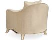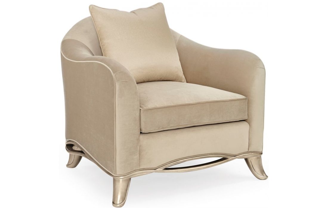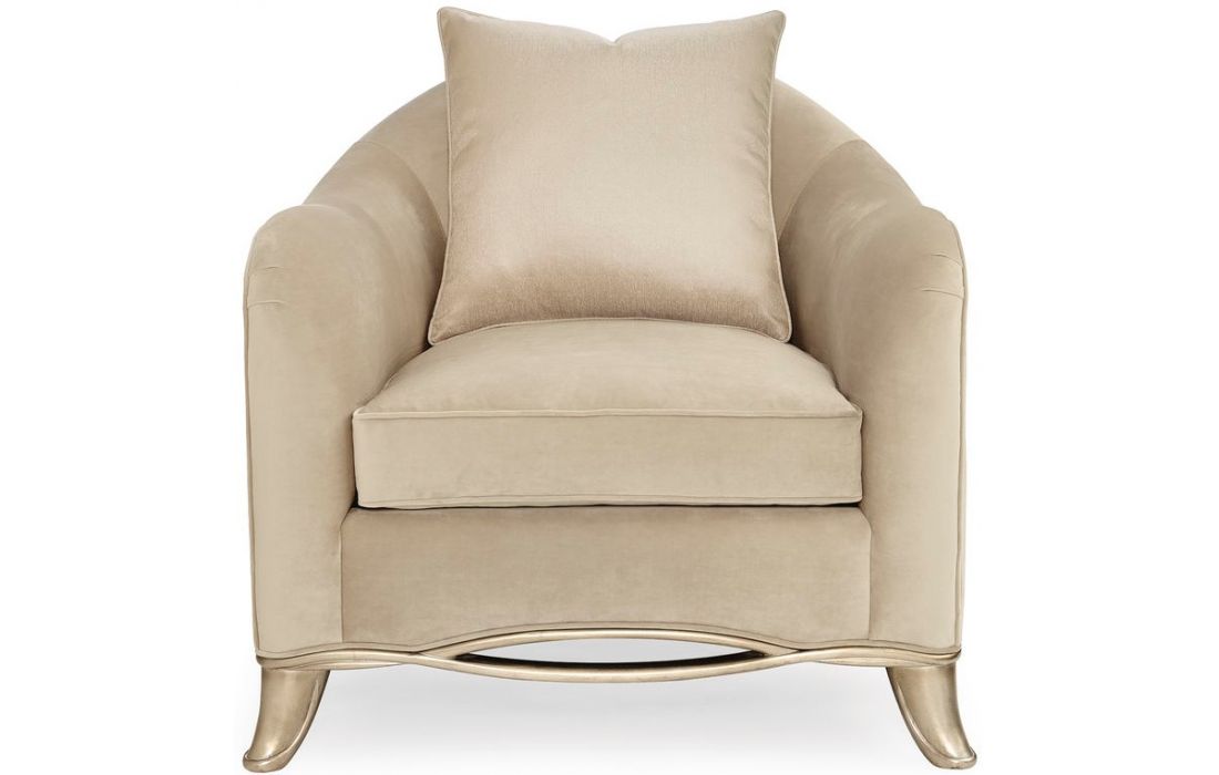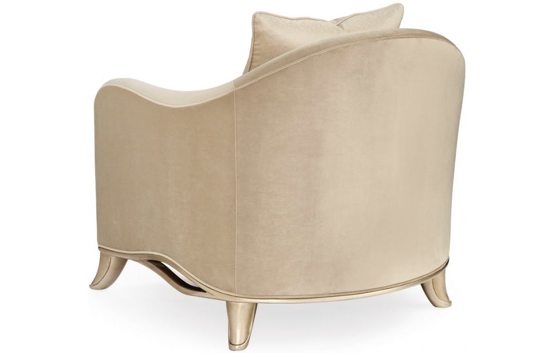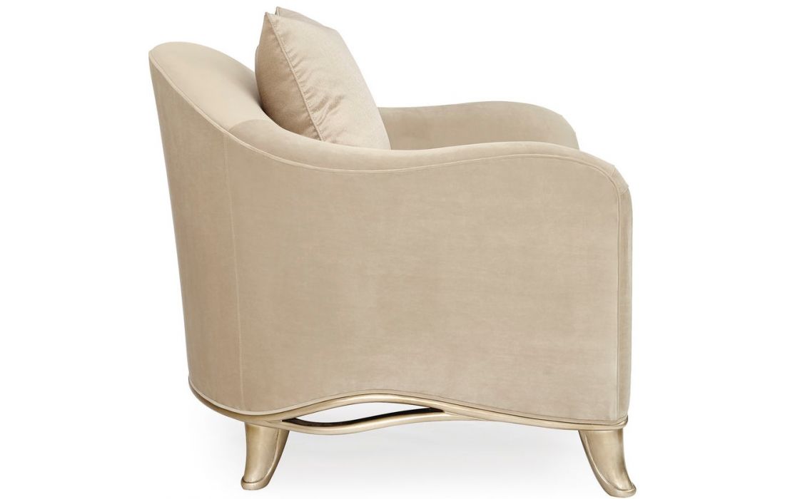 Elegantly wrapped in velvet, this highchair has a gentle curve in the back and arms that are a welcome respite after a long day. Wrapped around the base of the chair is the detail of the collection's delicately carved ribbon in a smooth gold leaf ingot finish. The chair is suspended from the floor in rounded trapezoid feet. Delightful and refined, it's a perfect addition to any room