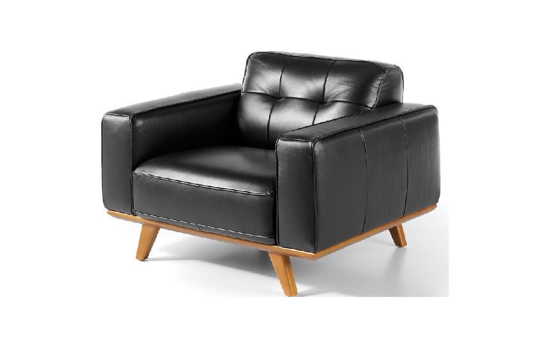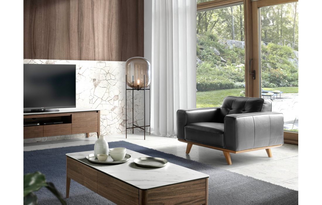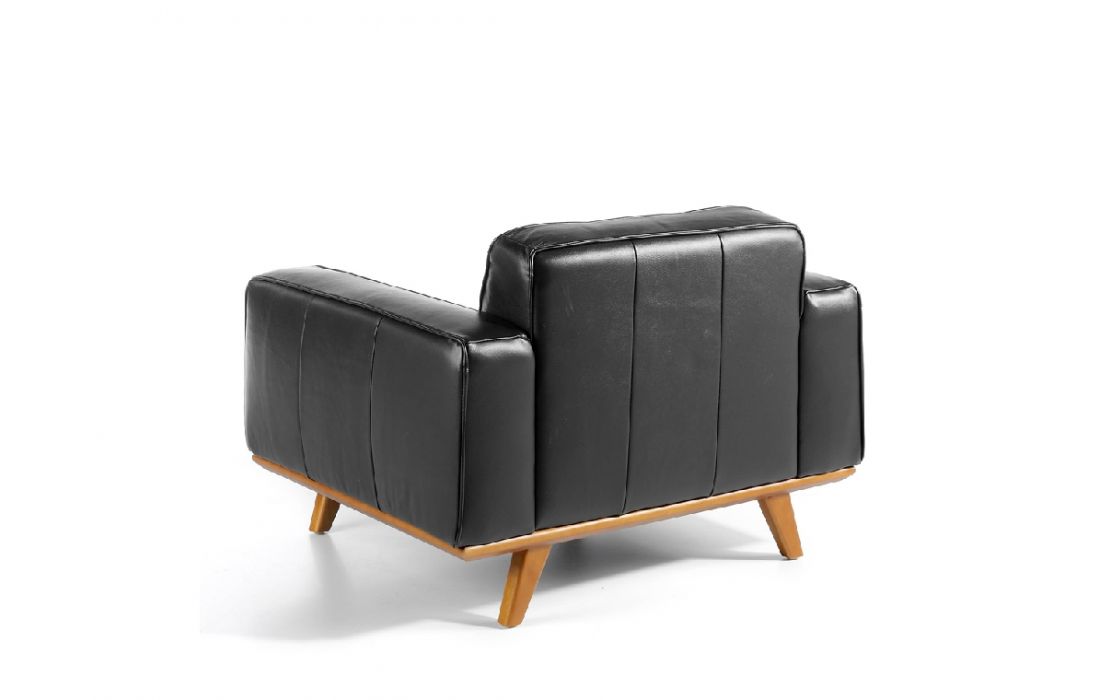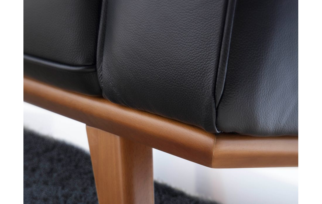 Leather upholstered Armchair with solid walnut legs