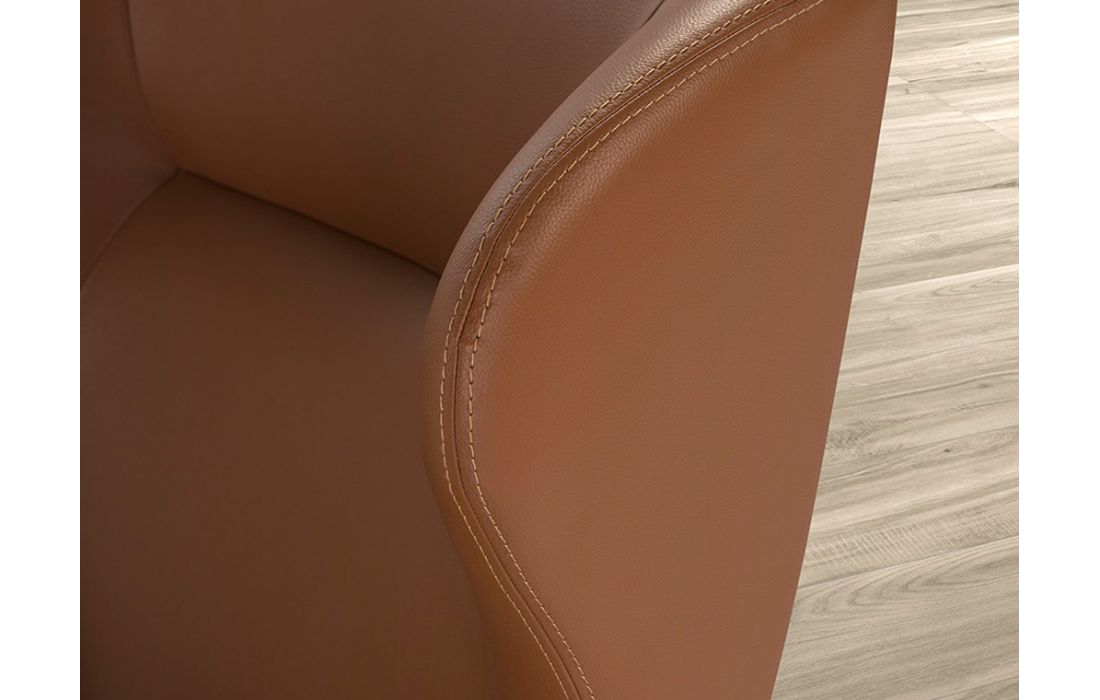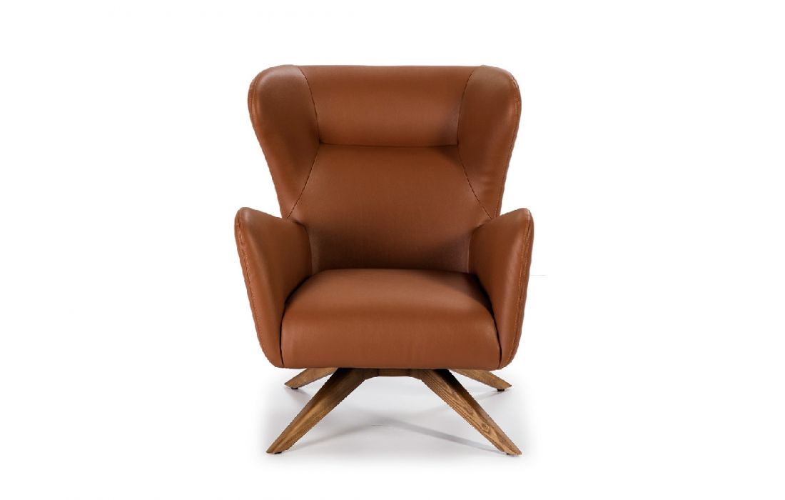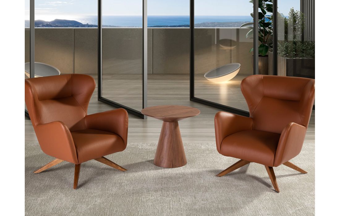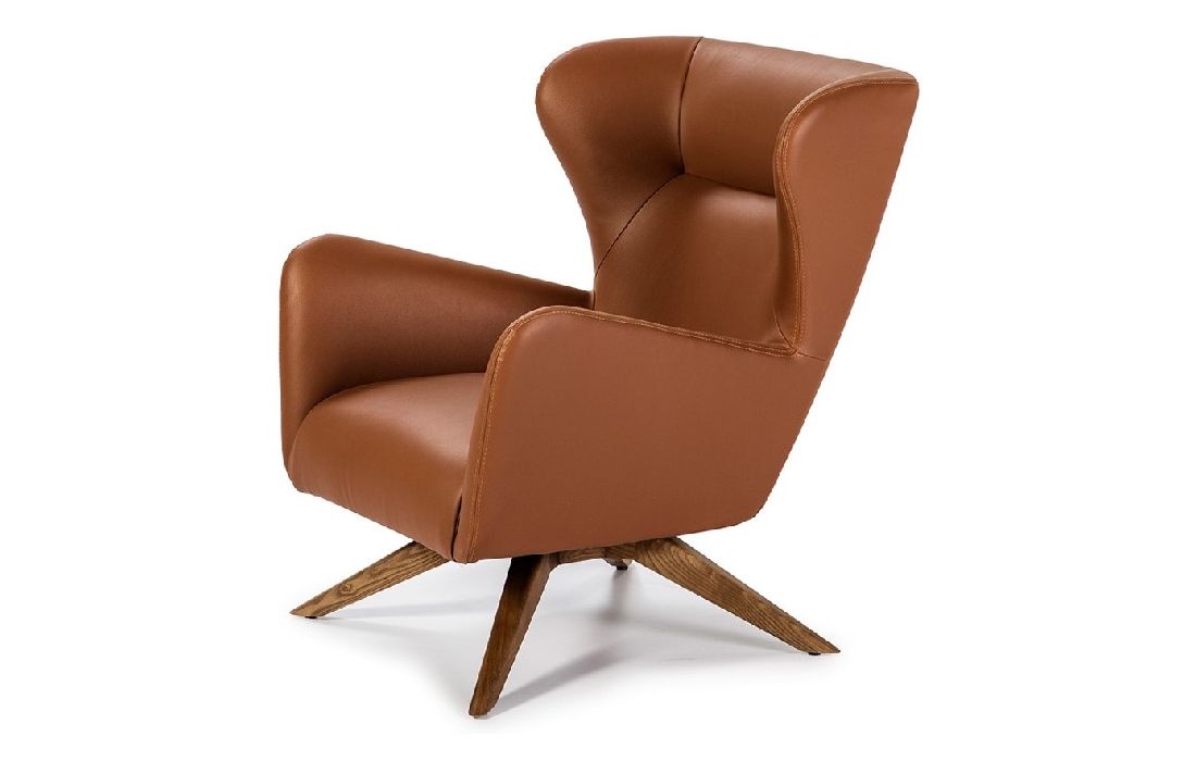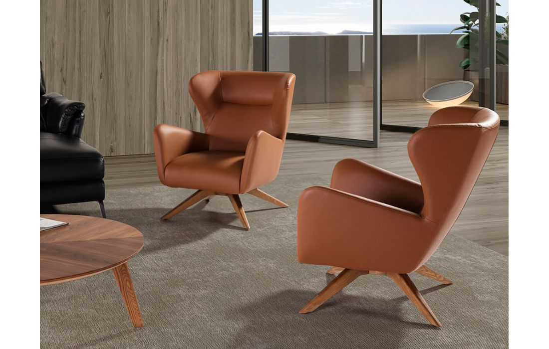 Swivel armchair upholstered in various possible finishes with solid walnut base