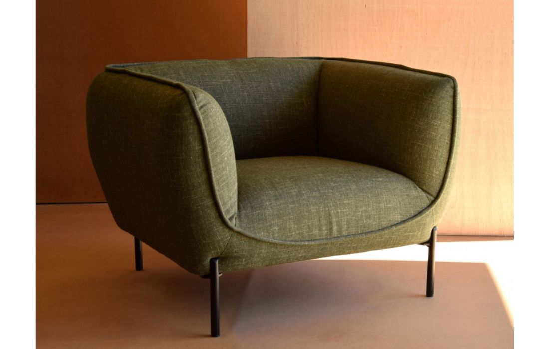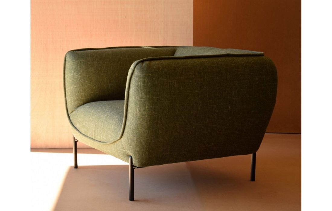 Armchair with black metal legs, upholstered in the various possible coverings.