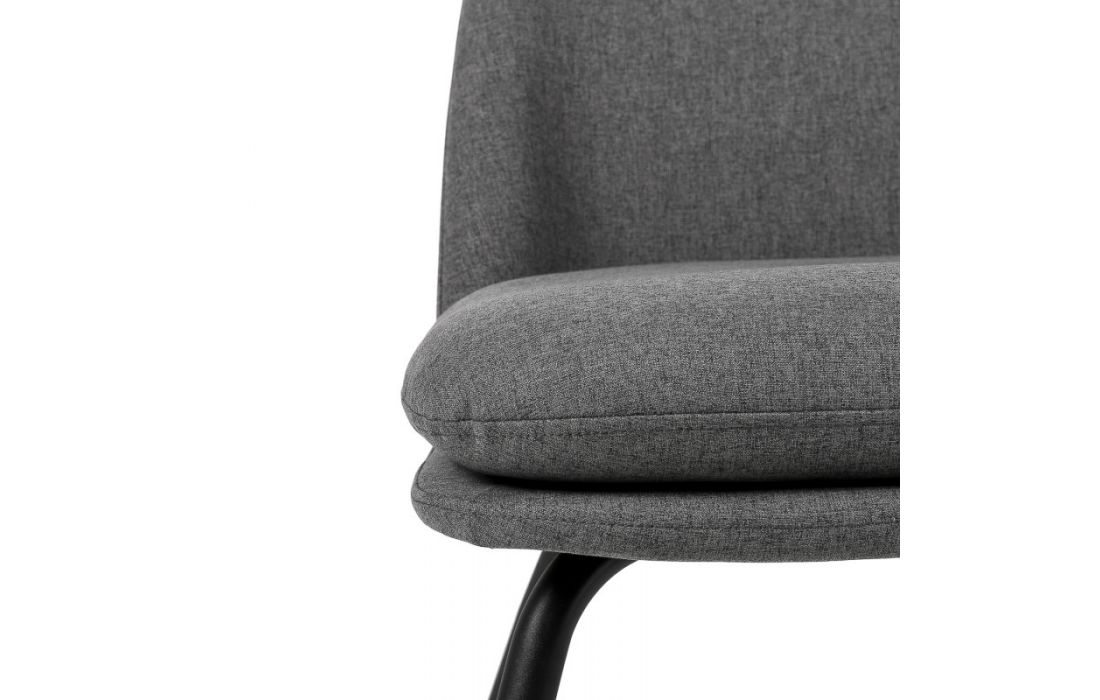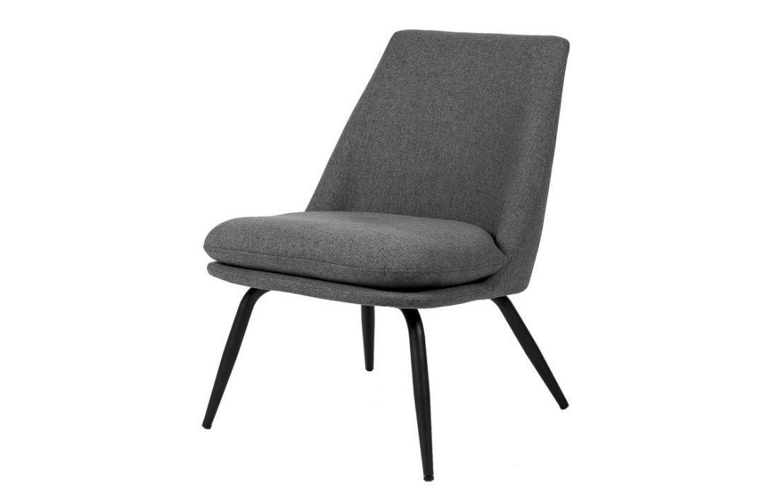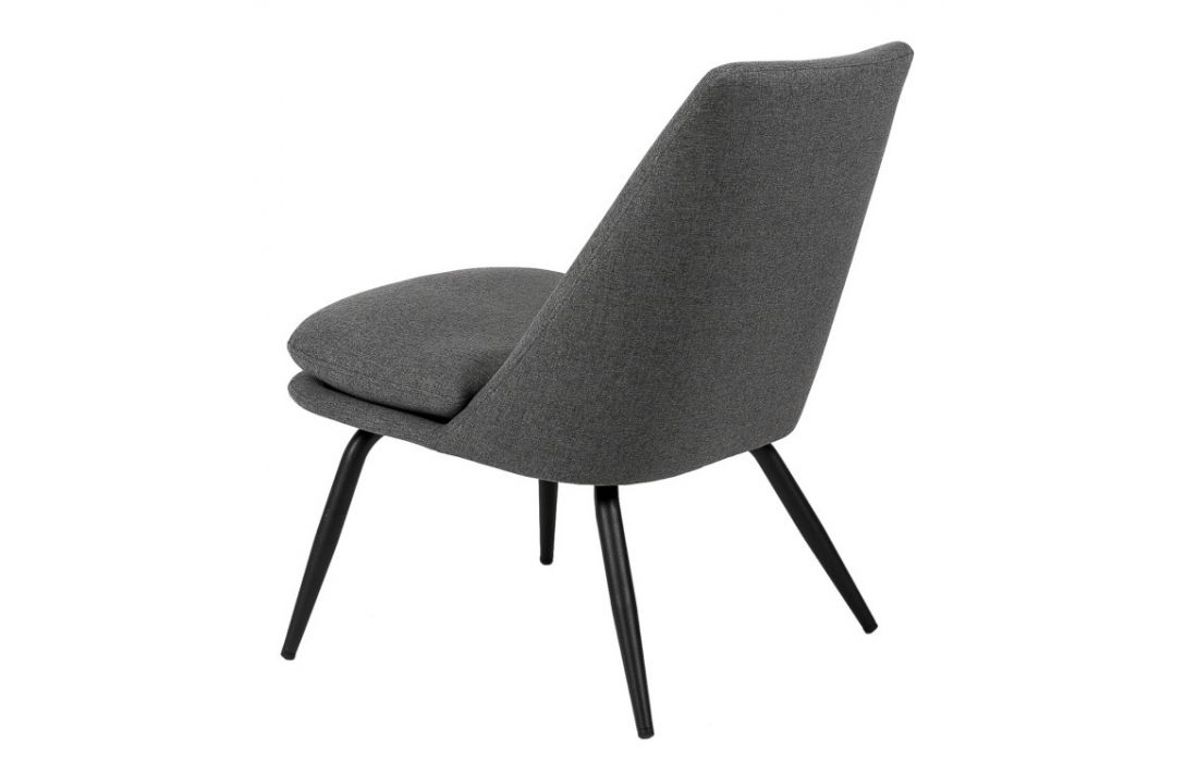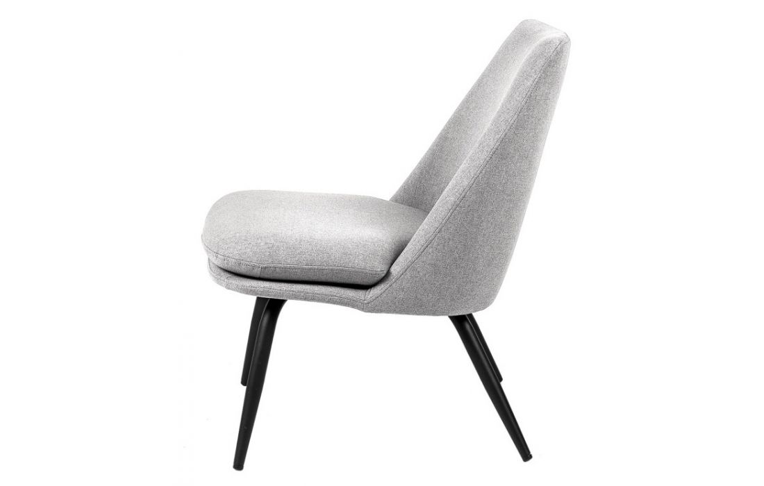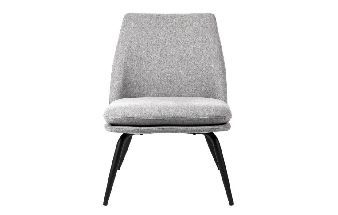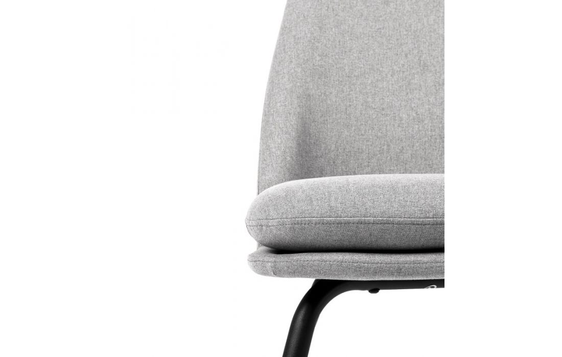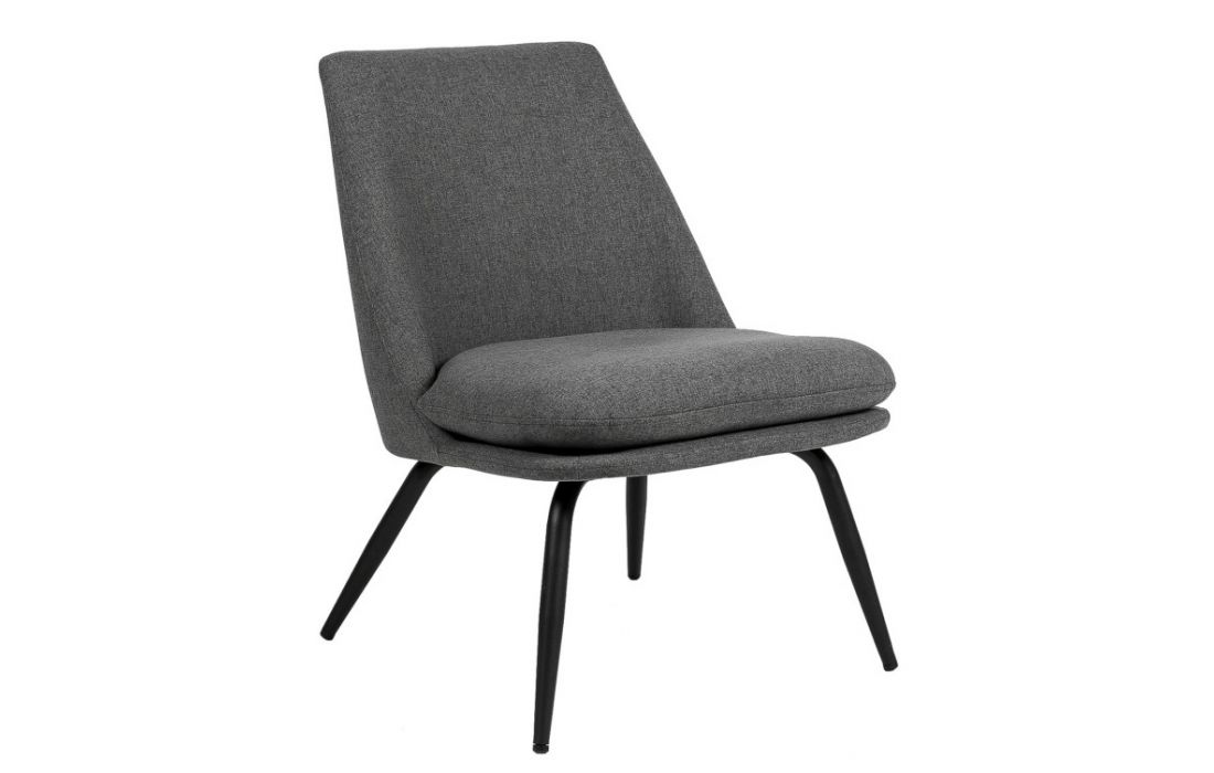 Armchair with black metal feet and upholstered in light gray, dark gray, mint and pink colors