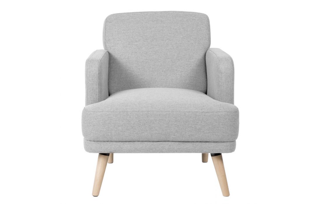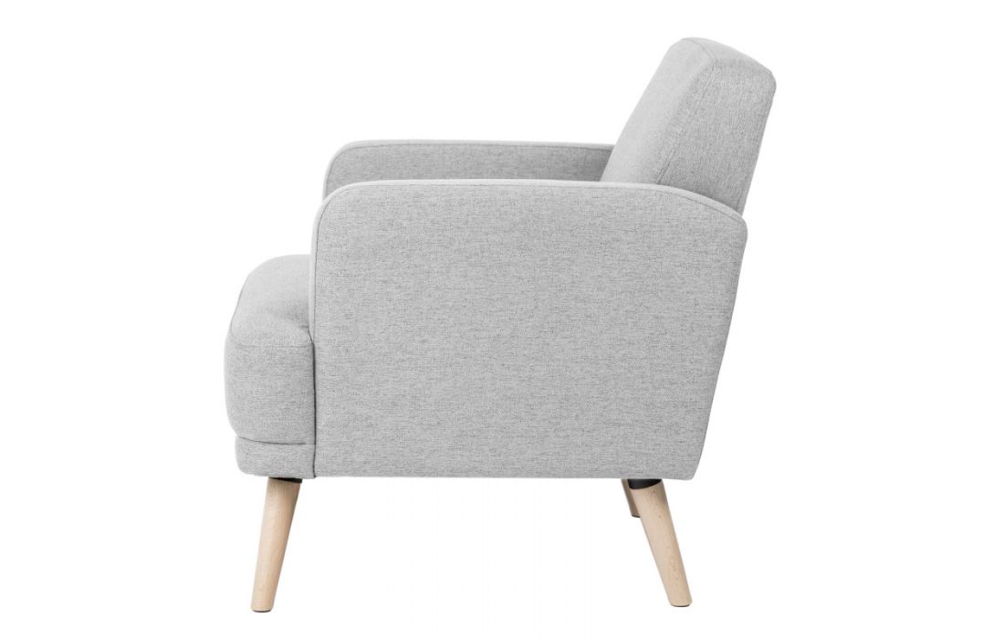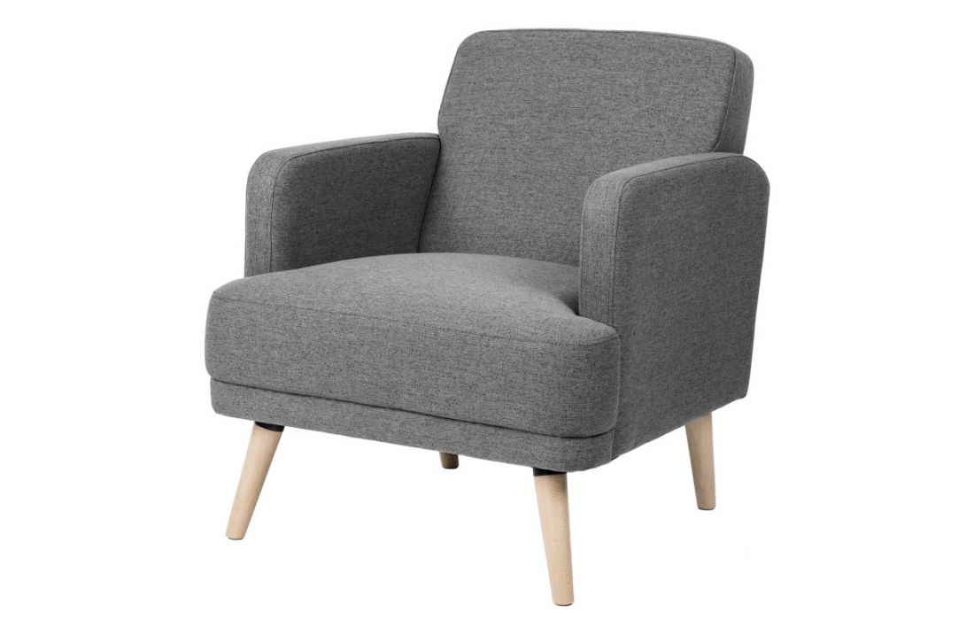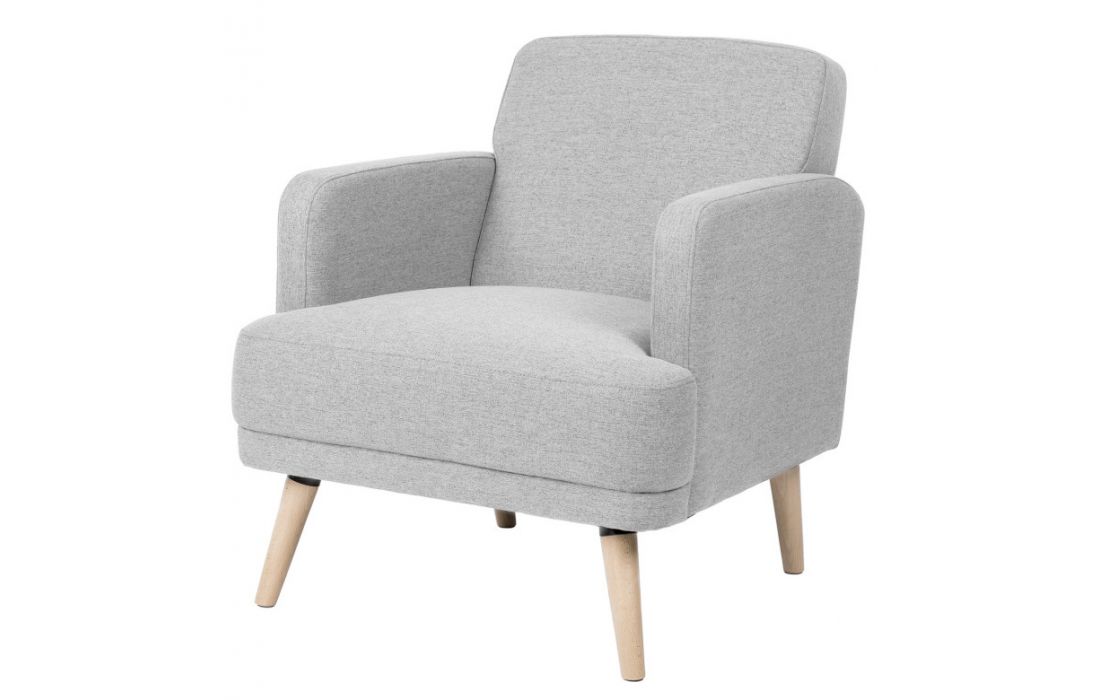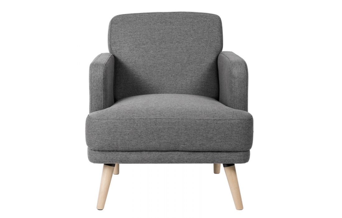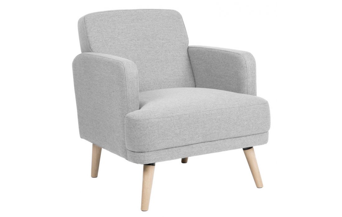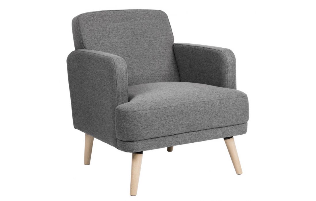 Armchair with natural colored wooden feet and upholstered in light gray, dark gray and mustard colors