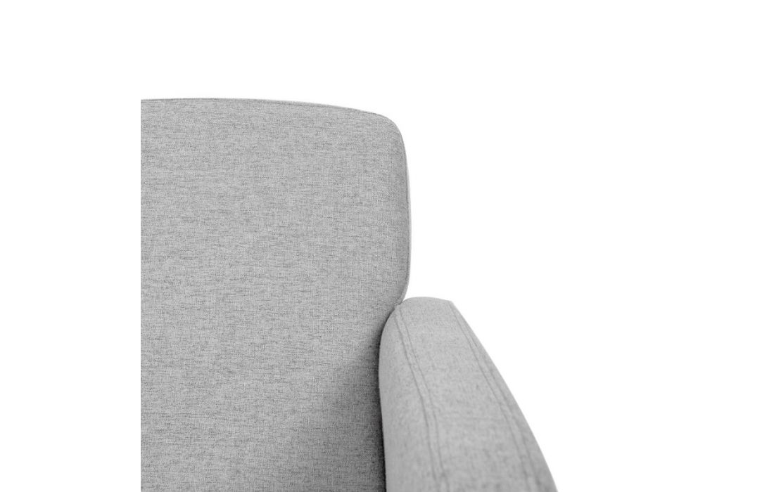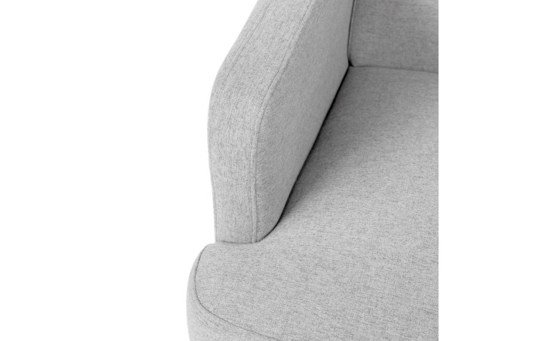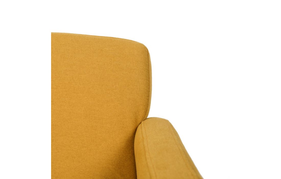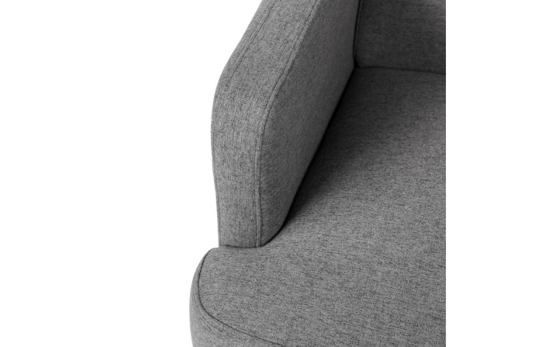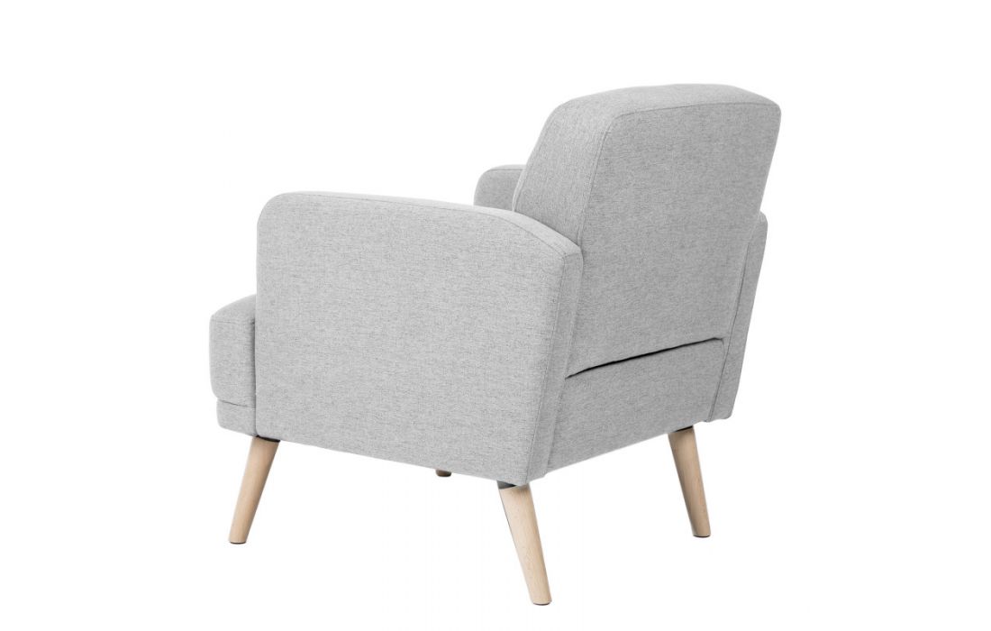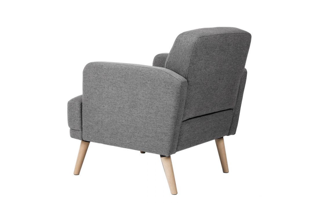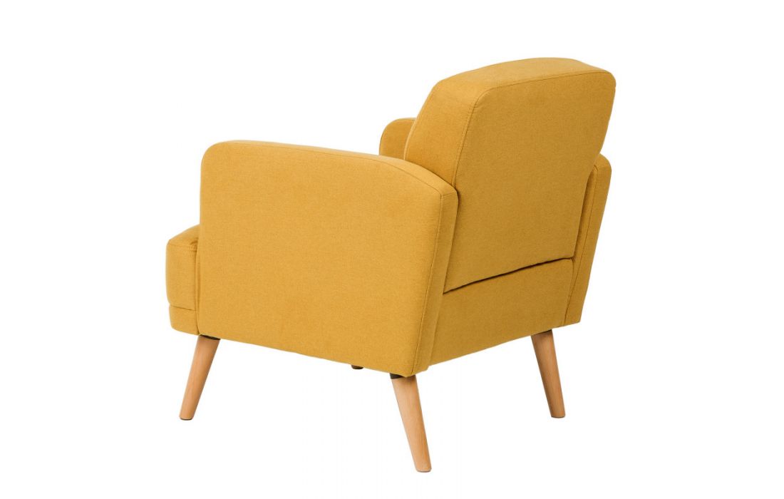 Armchair with natural colored wooden feet and upholstered in light gray, dark gray and mustard colors