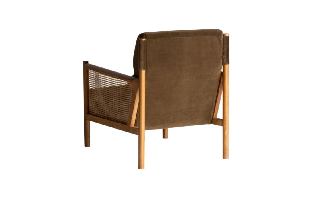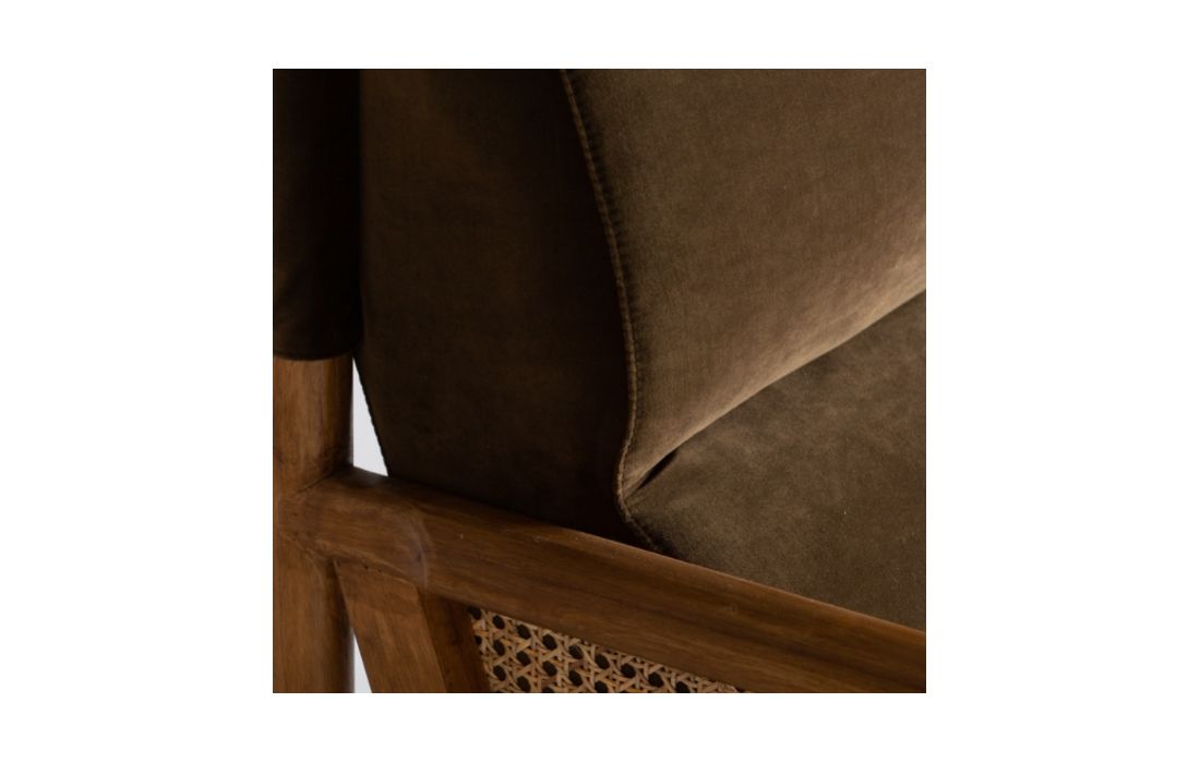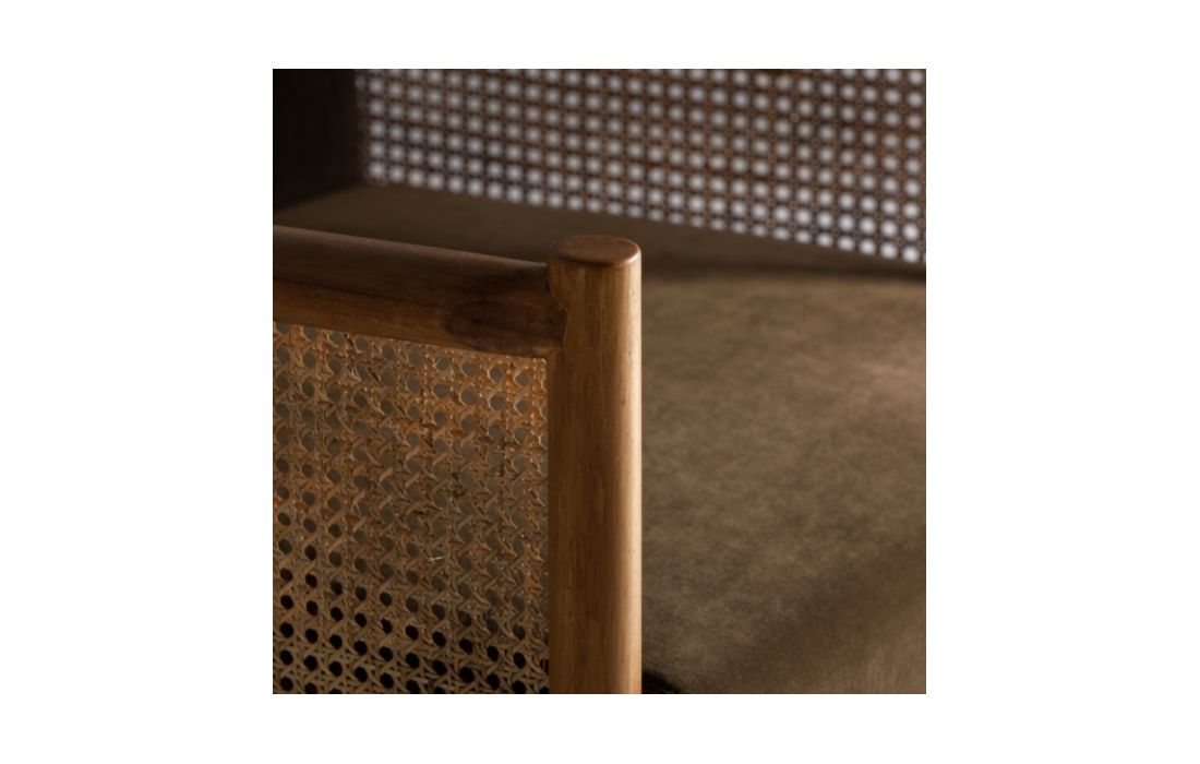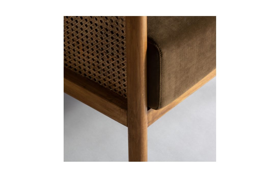 Colonial style armchair made of pine wood, rattan and green fabric.