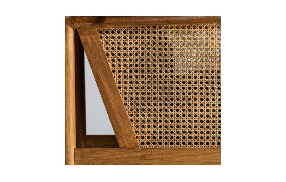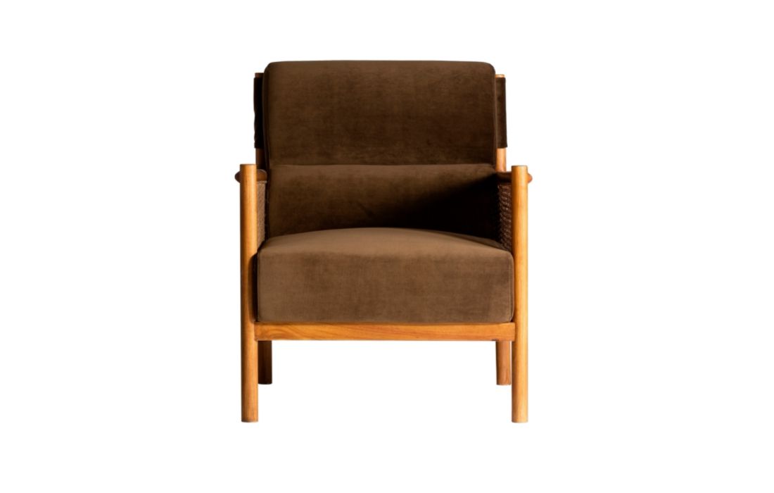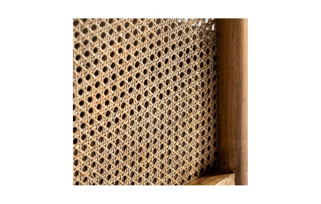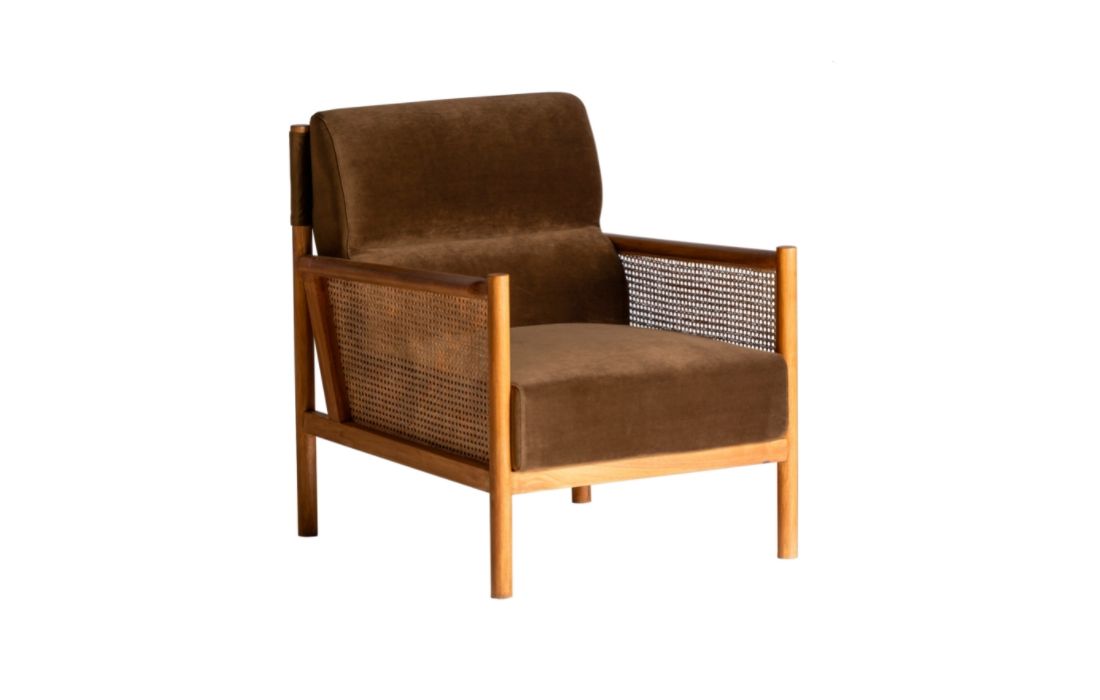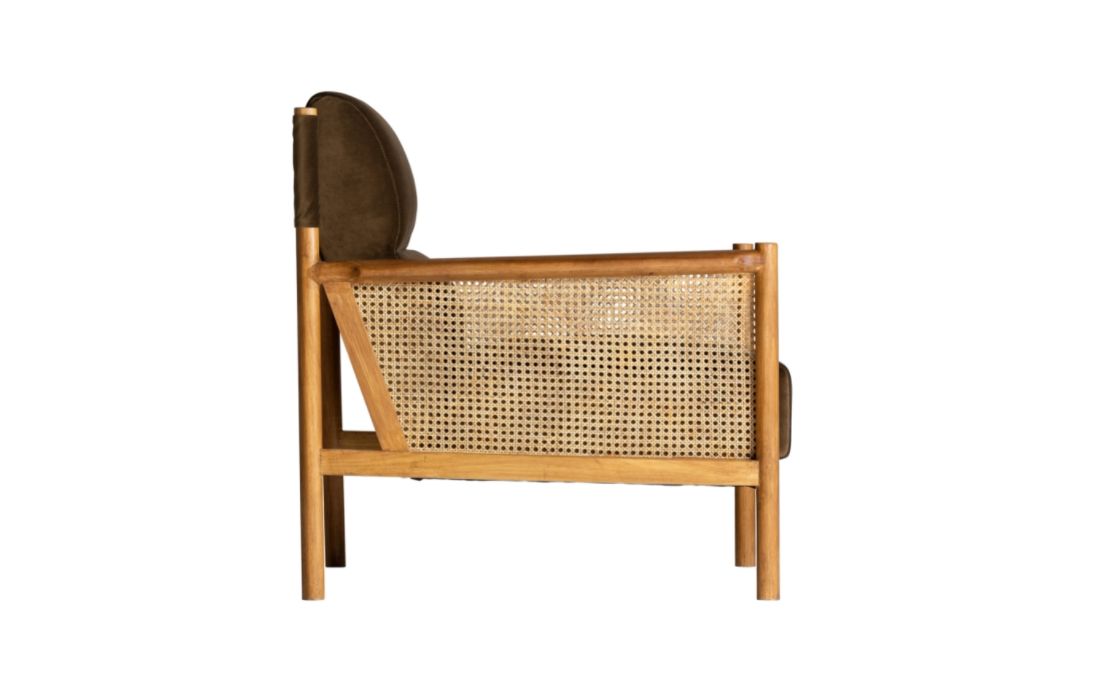 Colonial style armchair made of pine wood, rattan and green fabric.