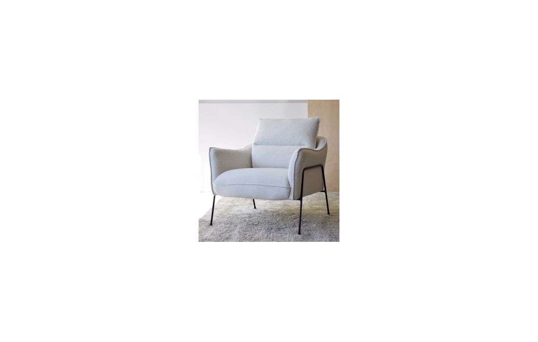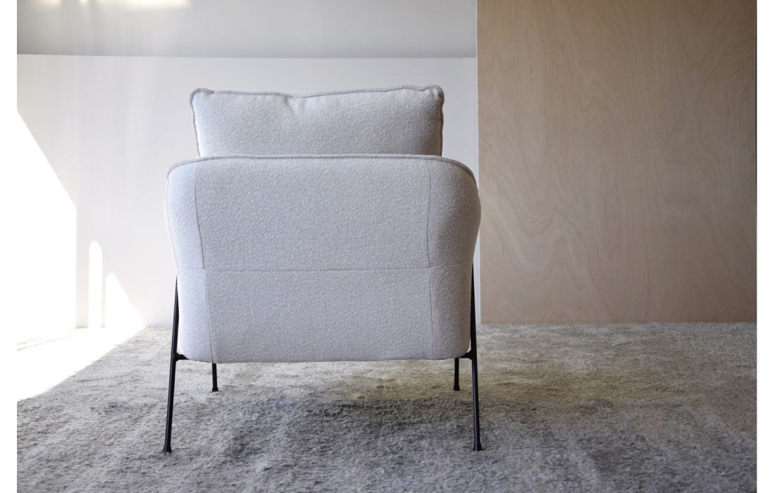 Armchair upholstered in white fabric and matt black lacquered metal feet.