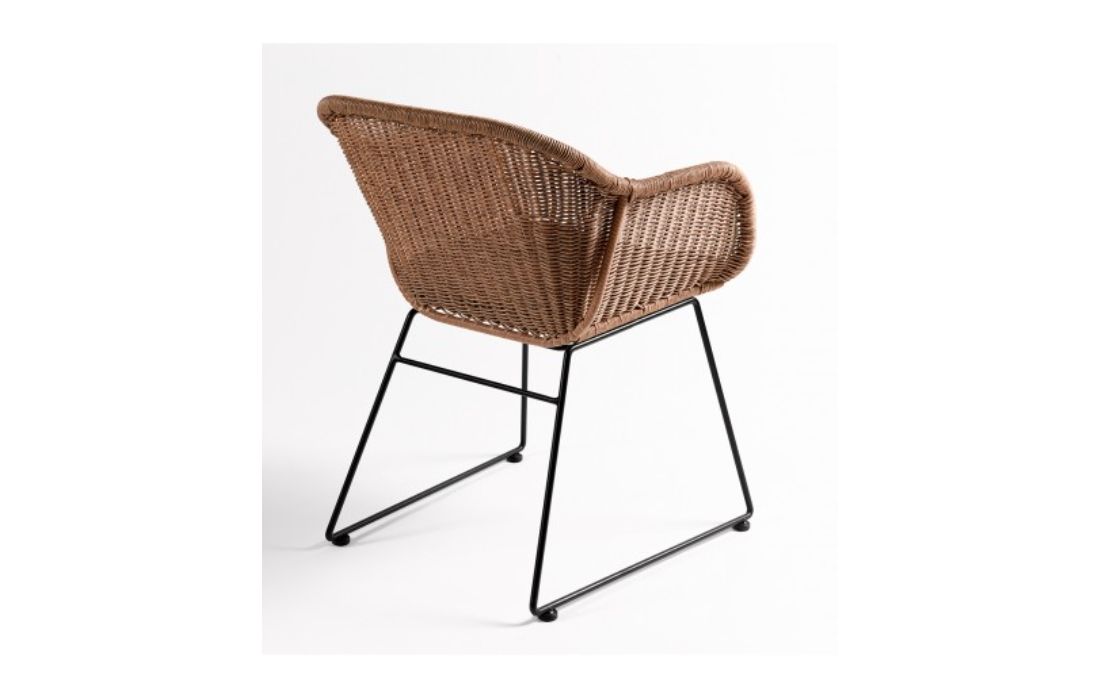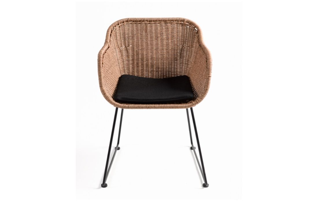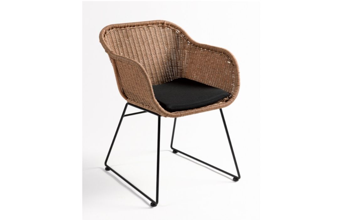 Armchair with synthetic rattan seat, black metal structure and black cushion.
