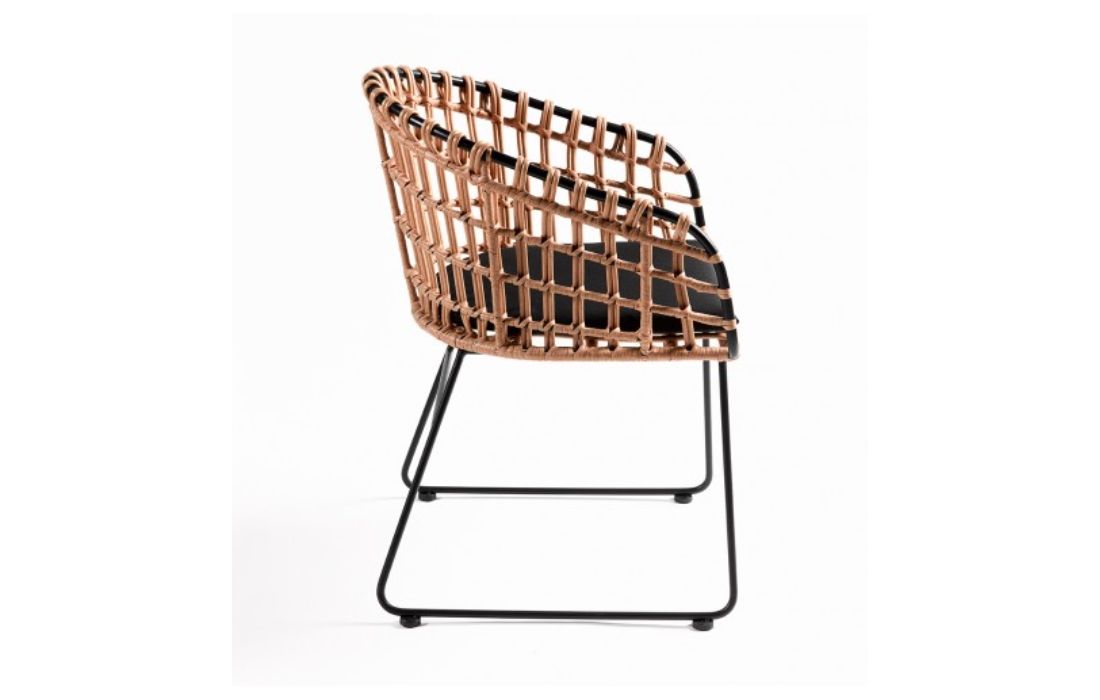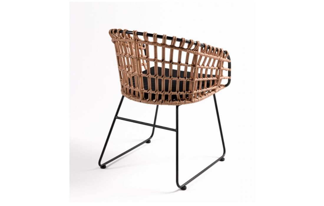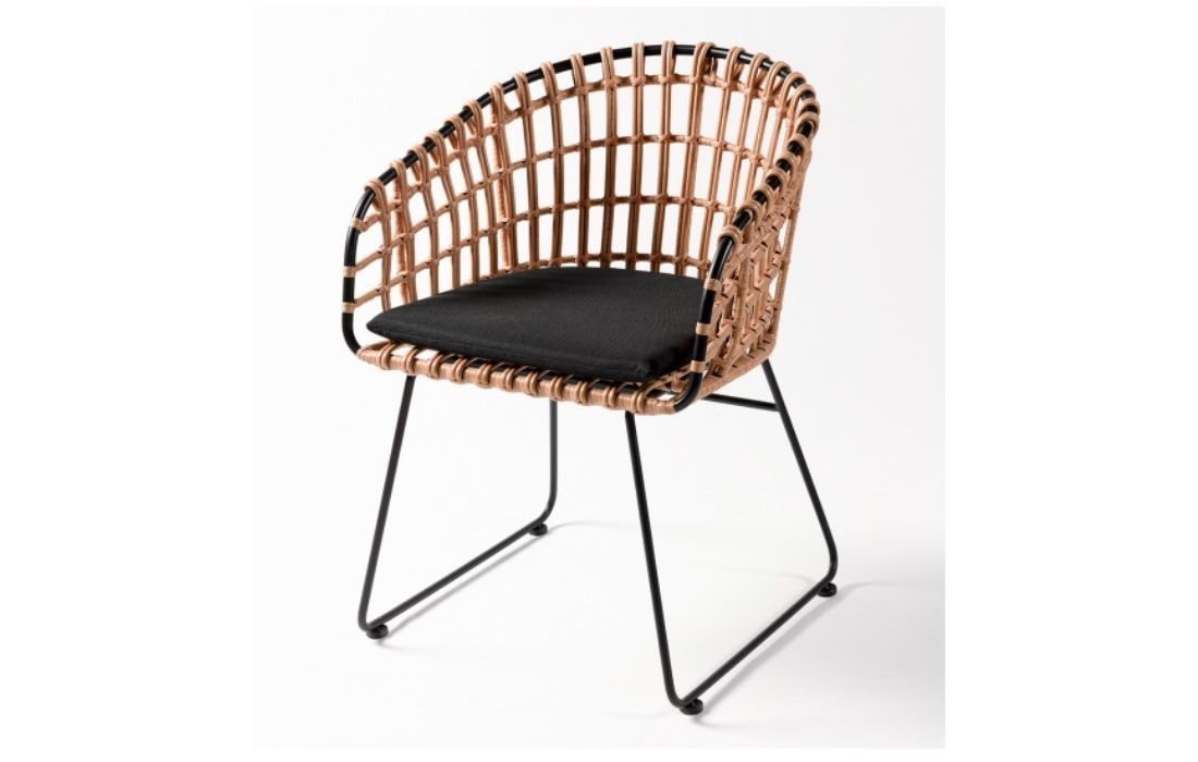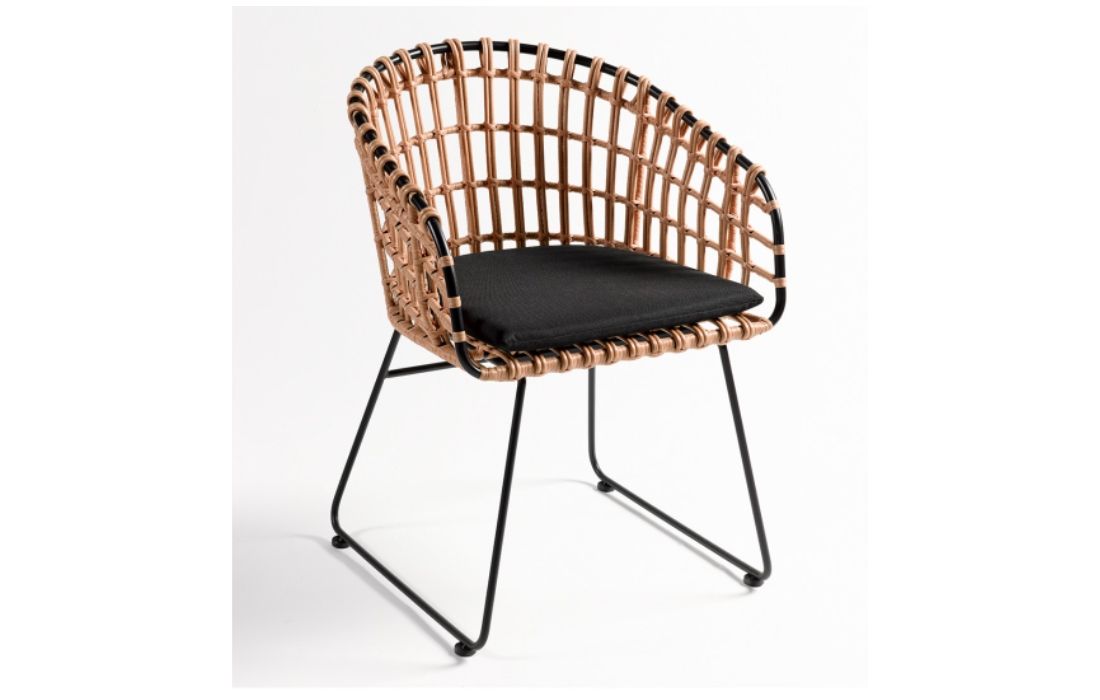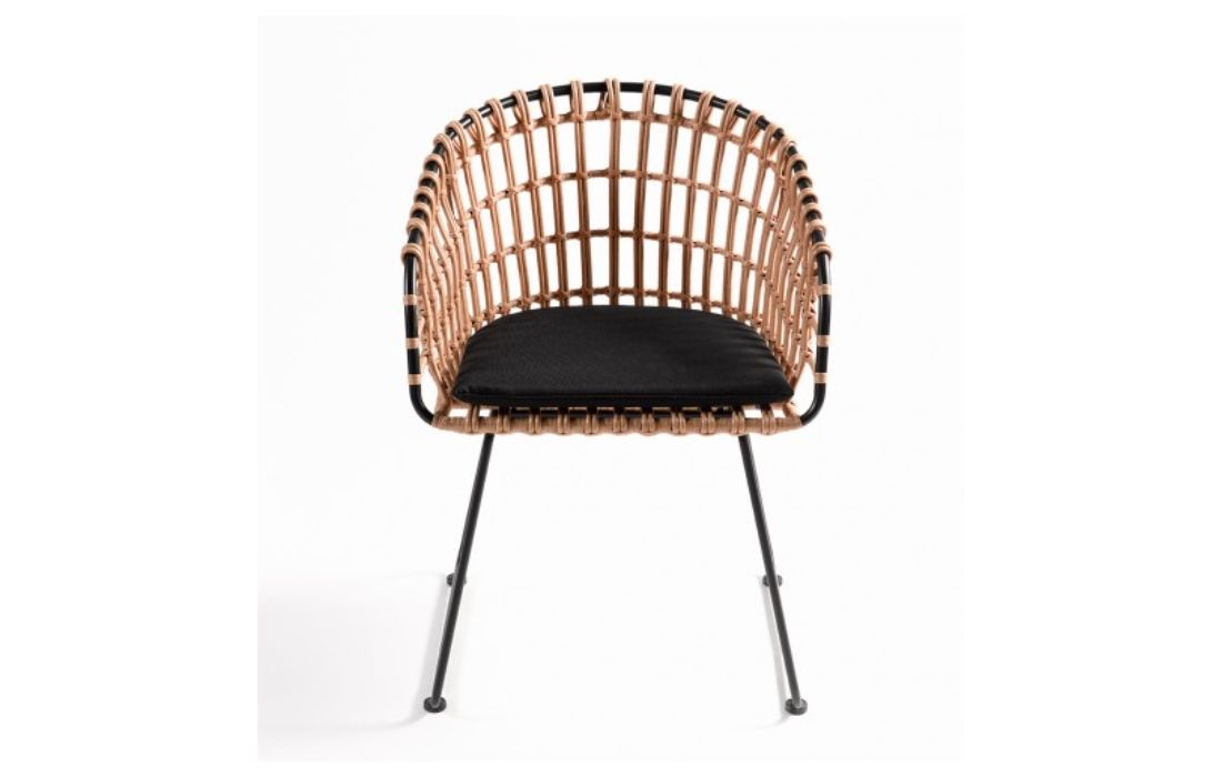 Armchair with synthetic rattan seat, black metal structure and black cushion.