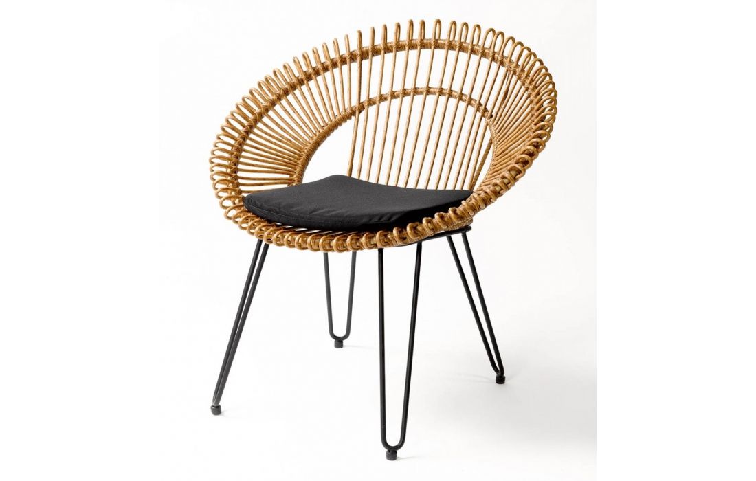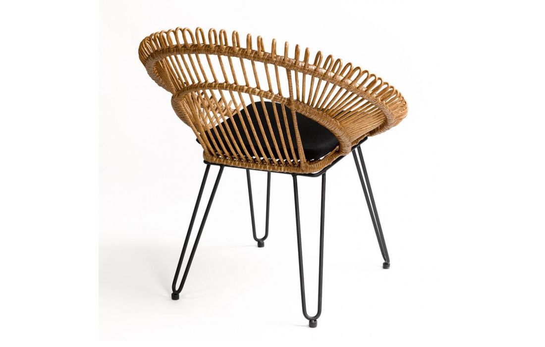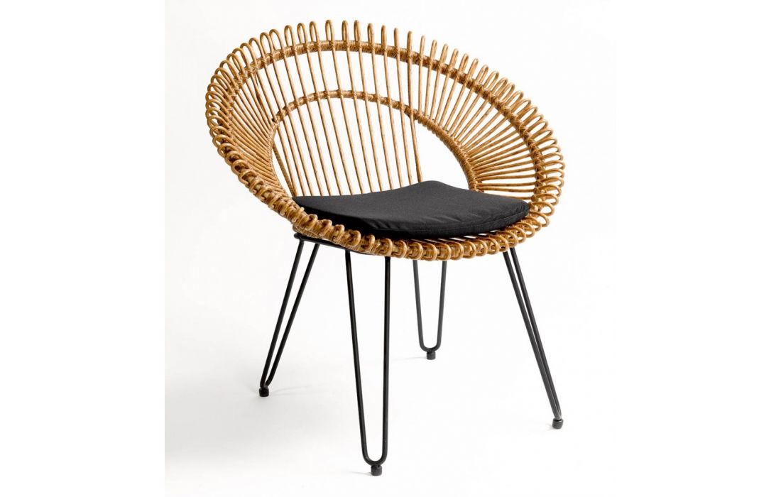 Synthetic rattan armchair with a rounded shape, a black metal structure and a black cushion.