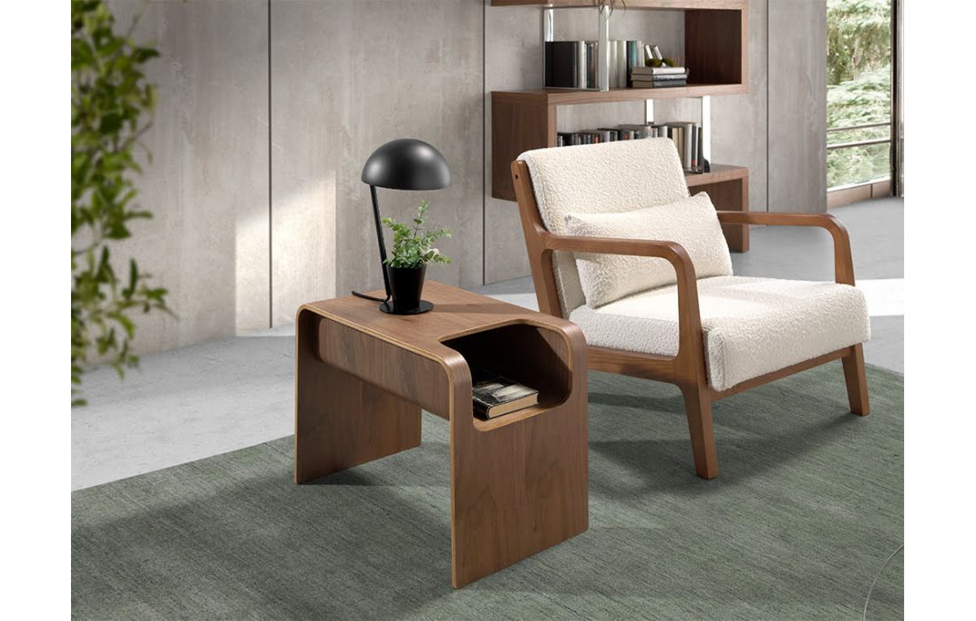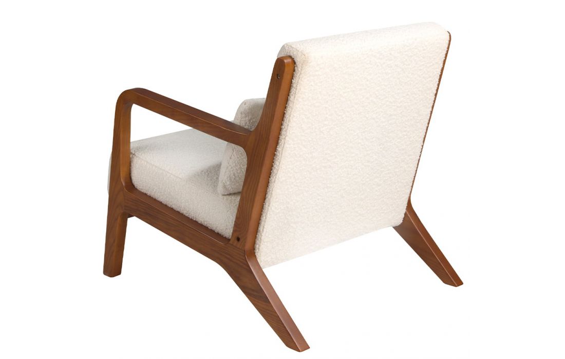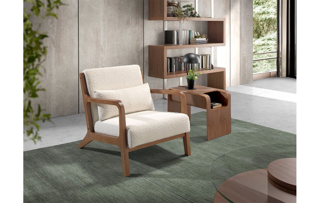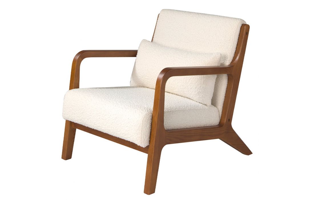Armchair upholstered in white fabric and structure in solid ash wood in walnut color