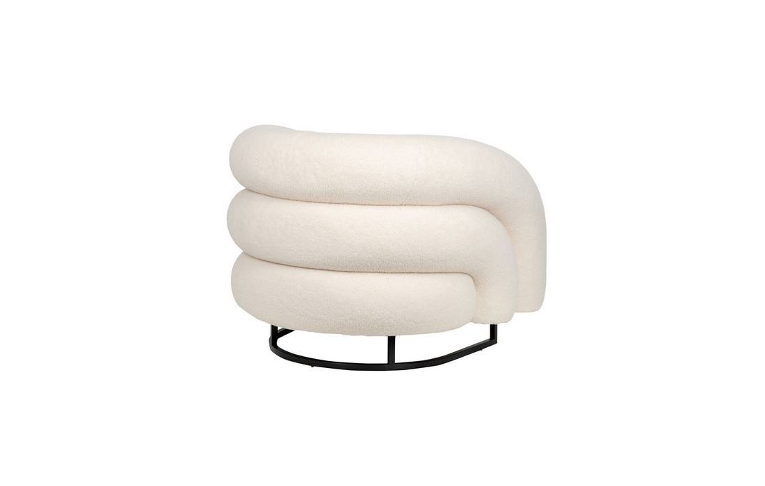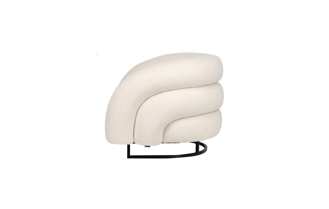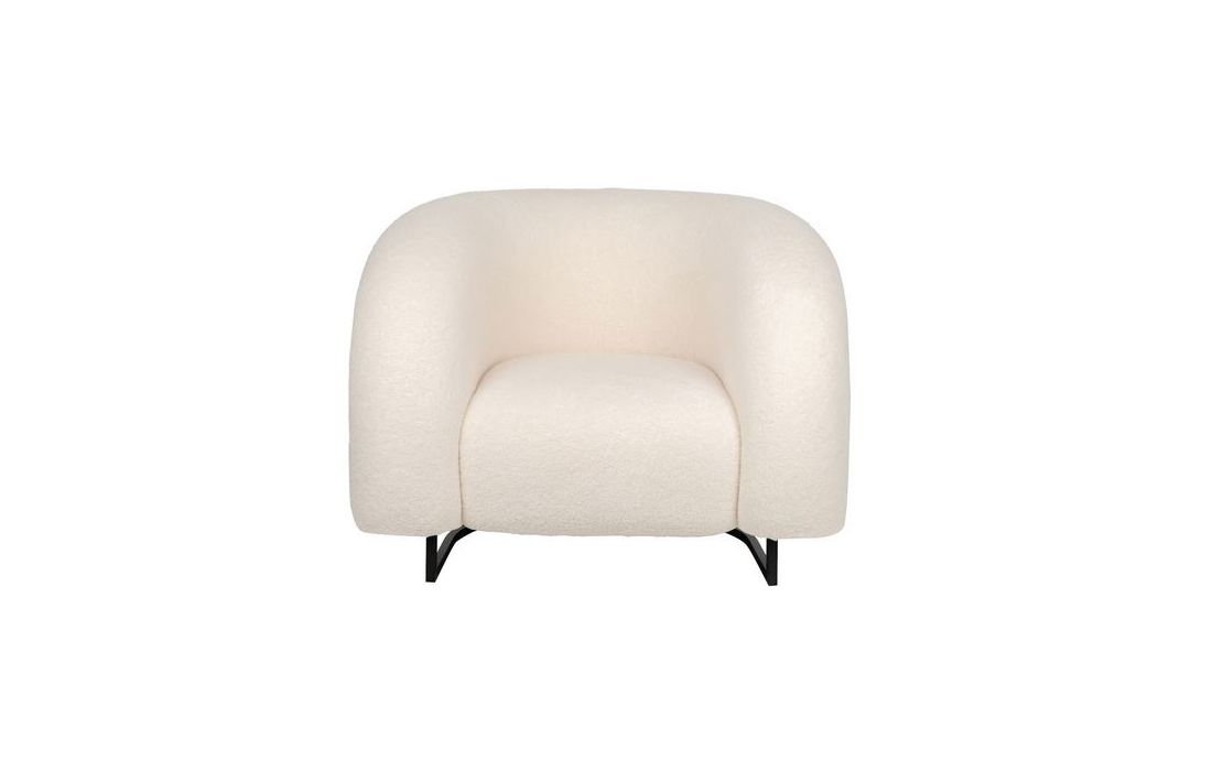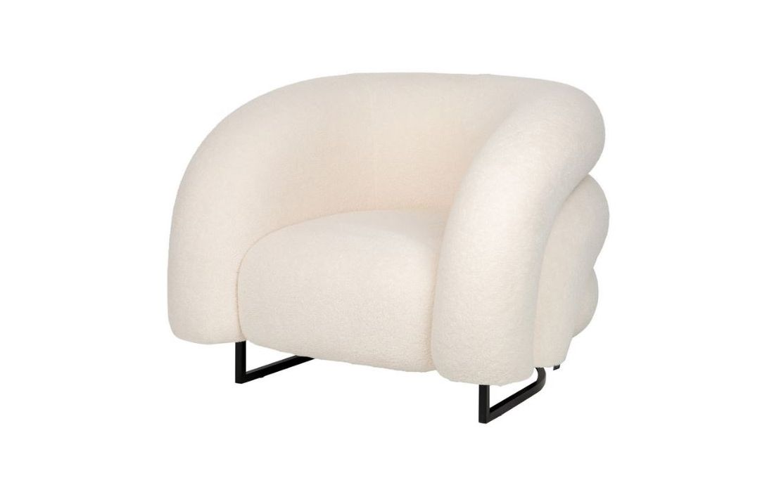 Armchair in white boucle fabric with stainless steel feet painted in black