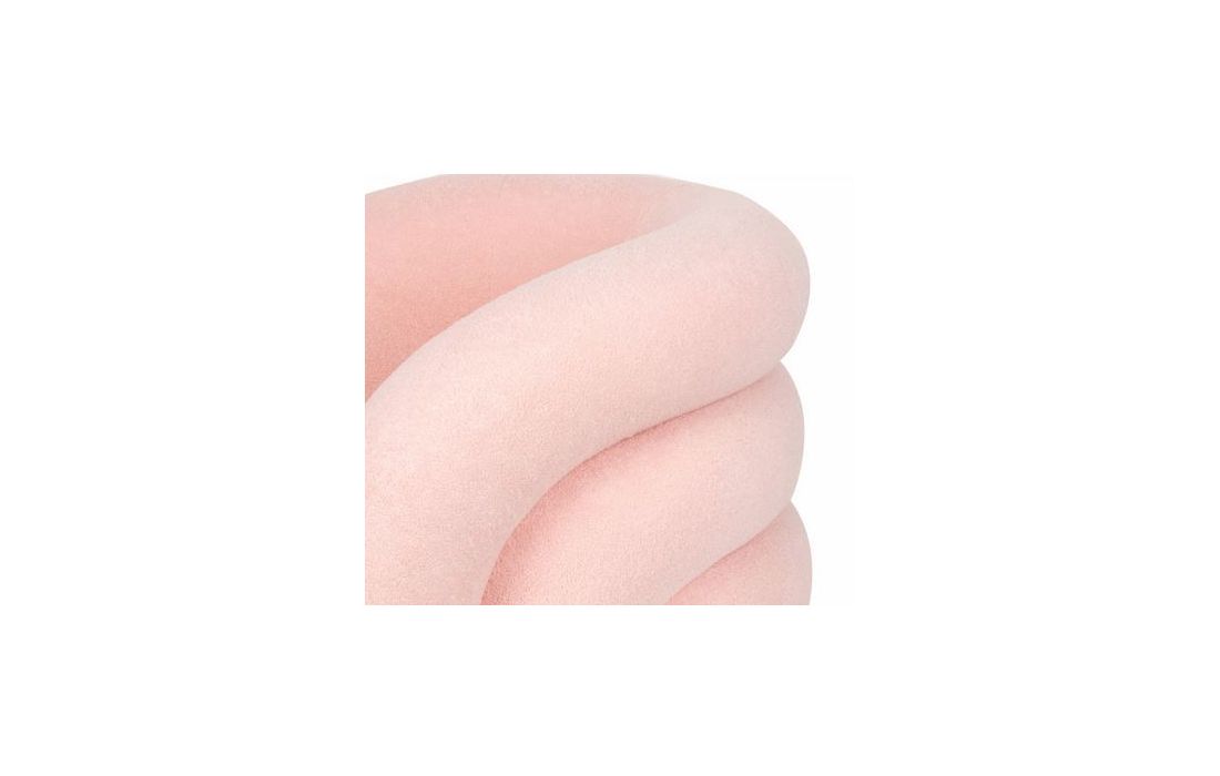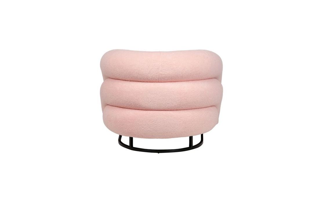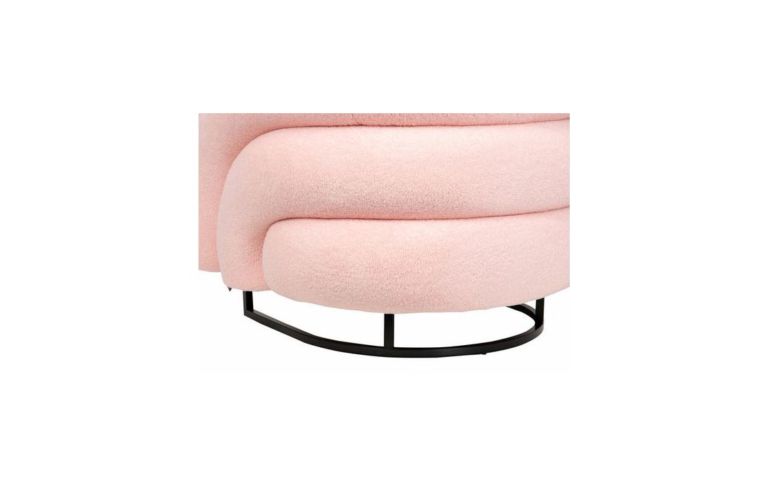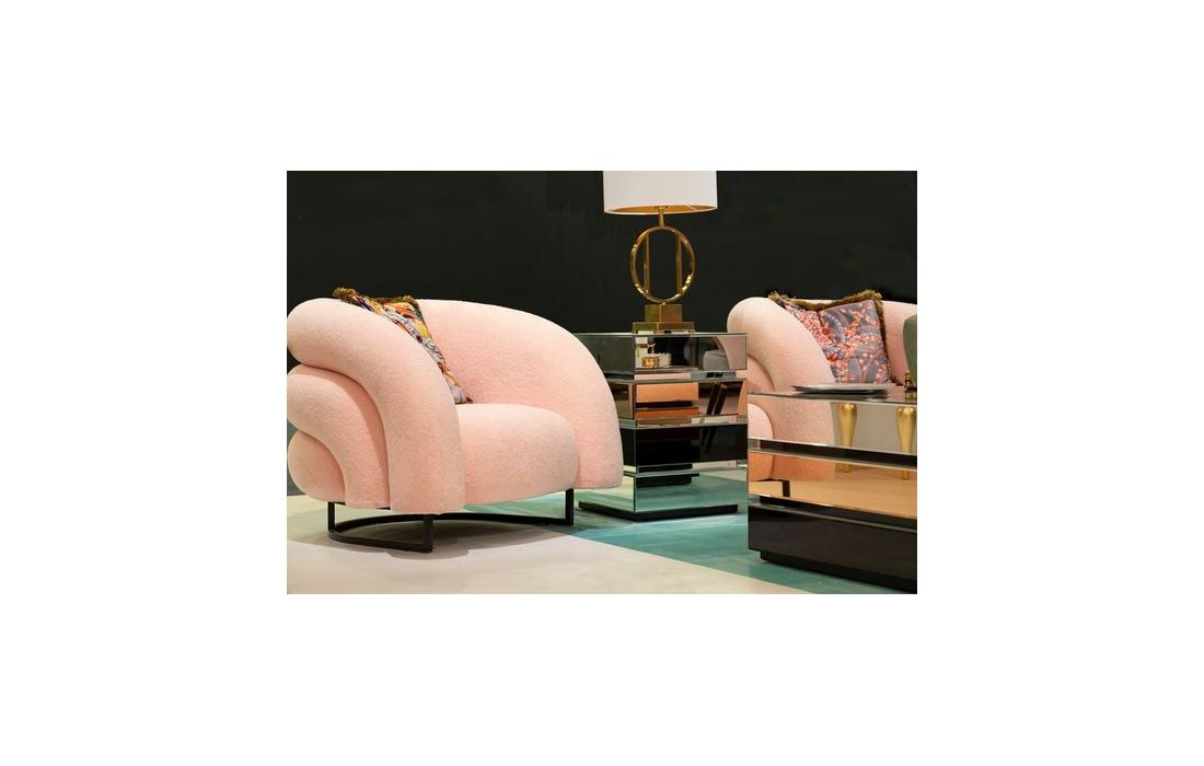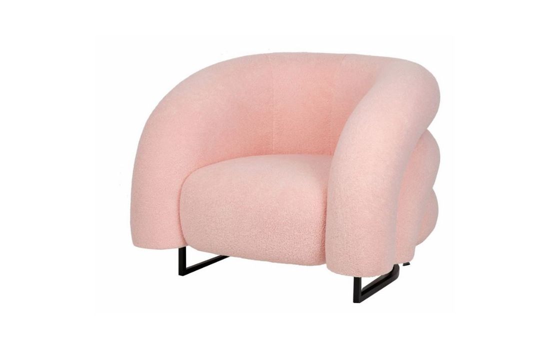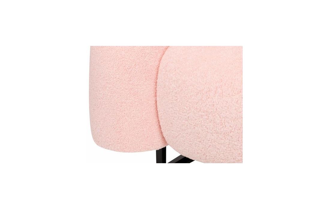 Armchair in pink boucle fabric with stainless steel feet painted in black