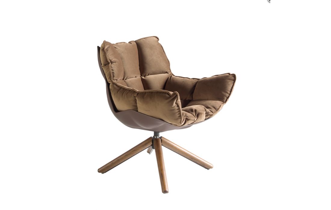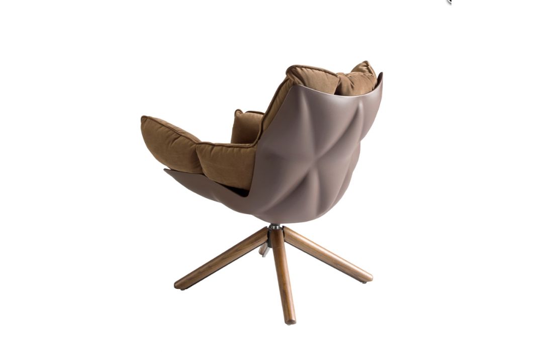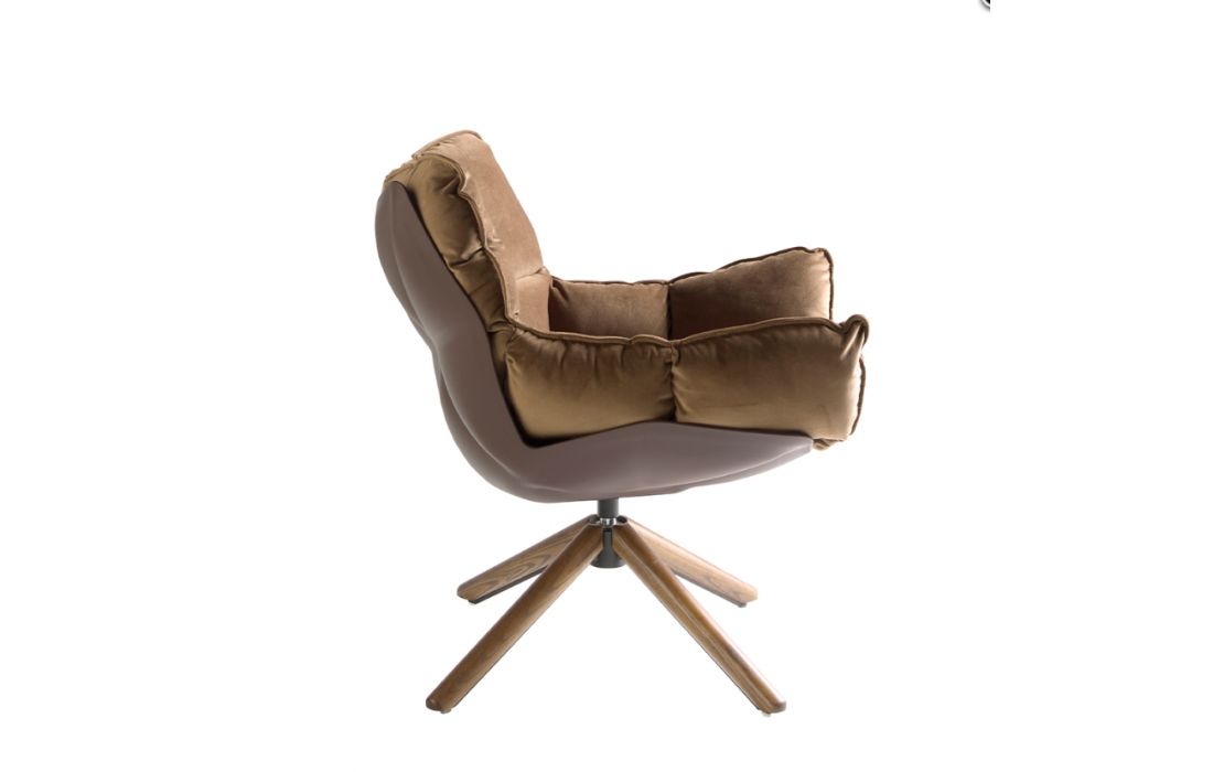 Swivel armchair upholstered in brown velvet fabric with walnut wooden legs. A swivel armchair with a modern design