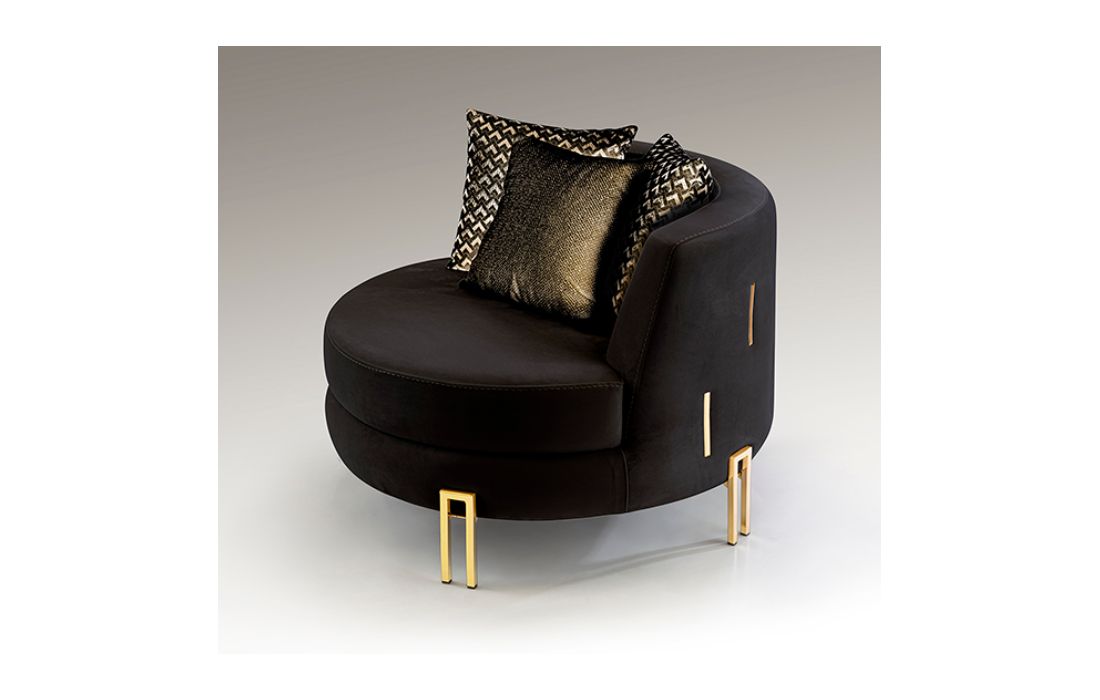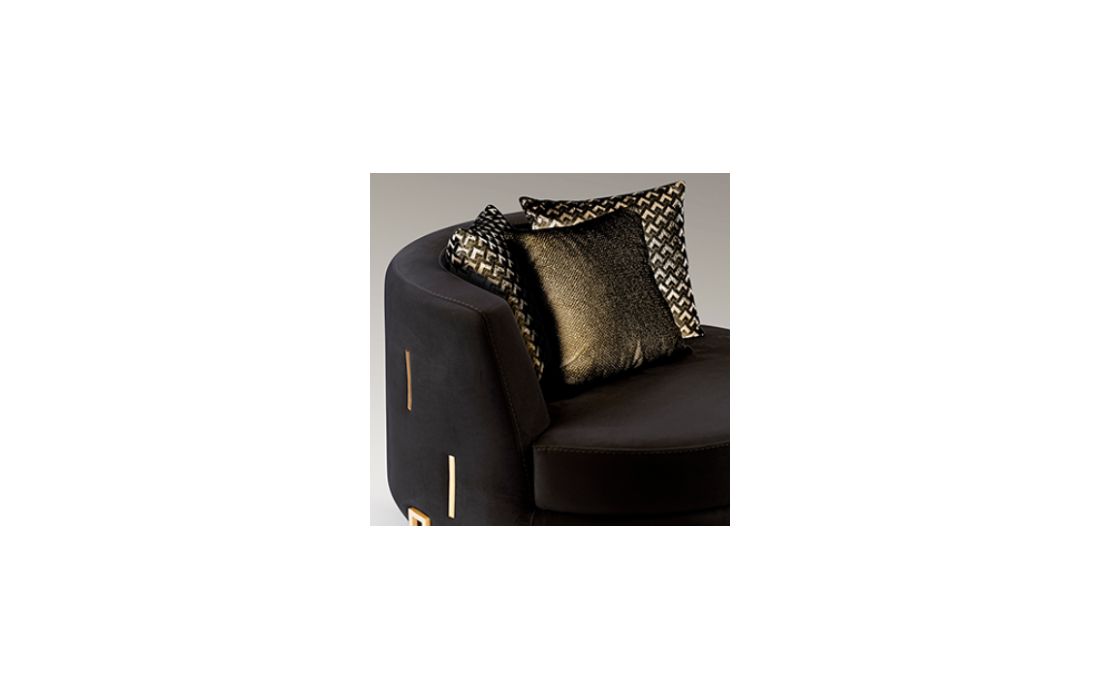 Armchair, upholstered in black velvet, matching cushions. Metal legs and decorative plates in gold finish.Recipient :
