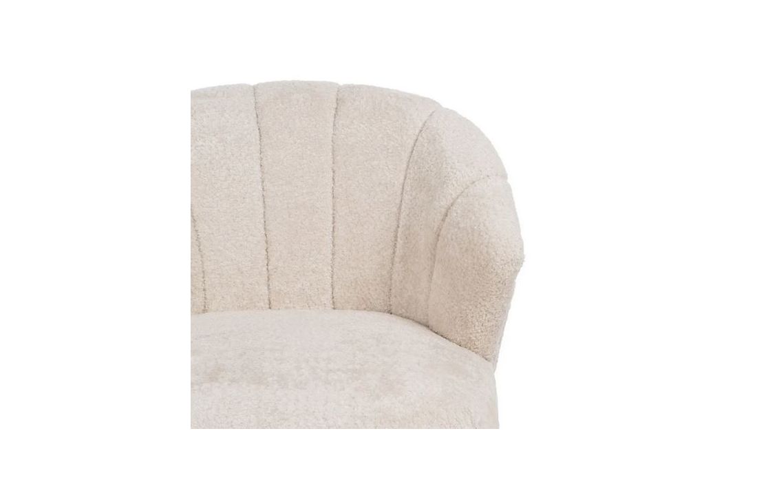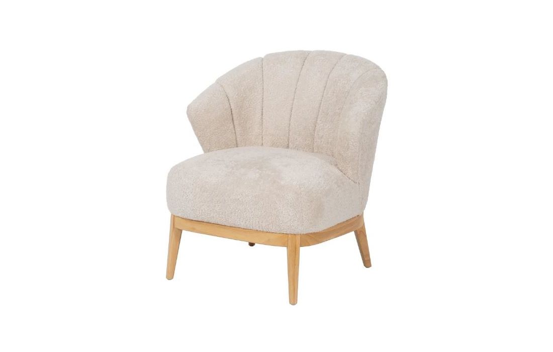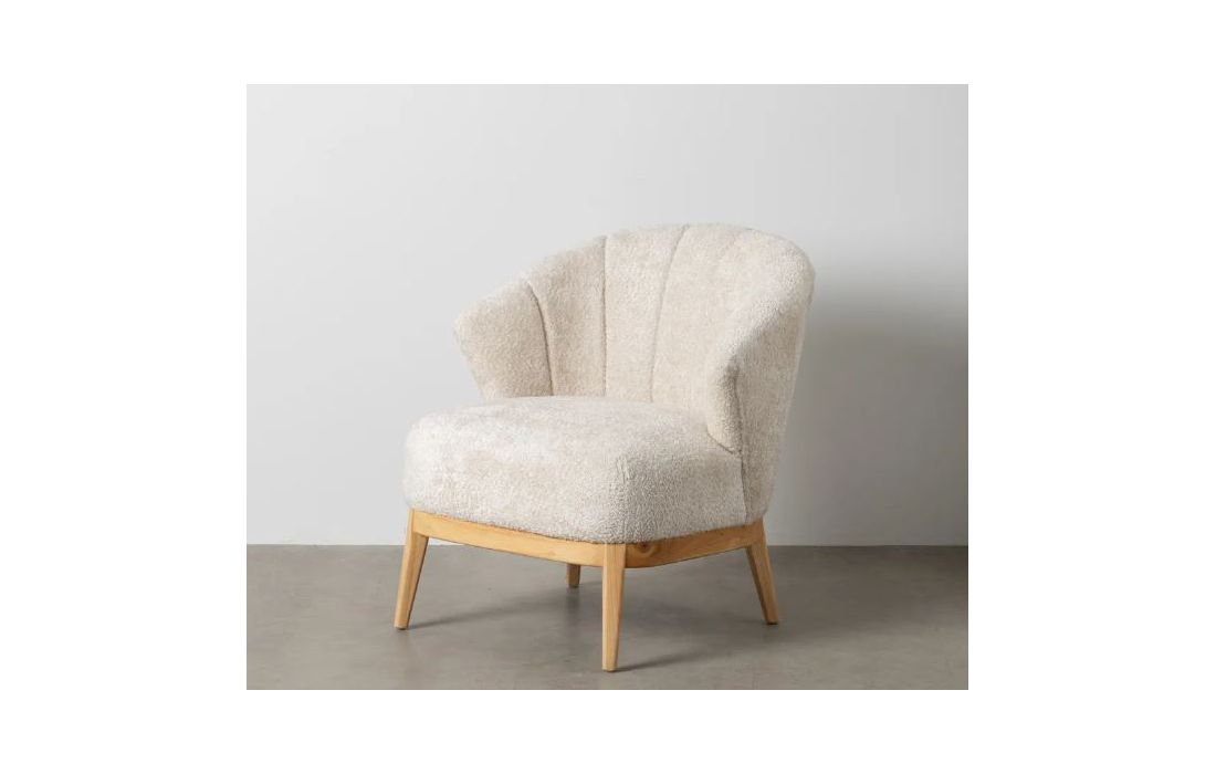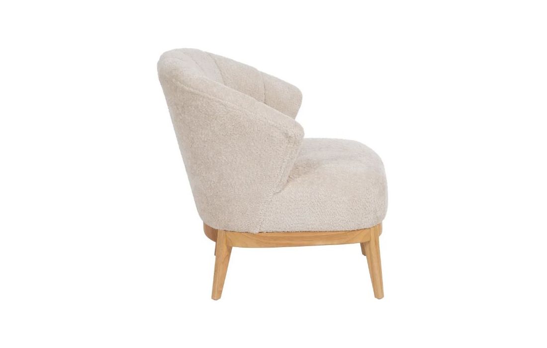 Armchair with legs in natural colored rubber wood and upholstery in cream colored fabric