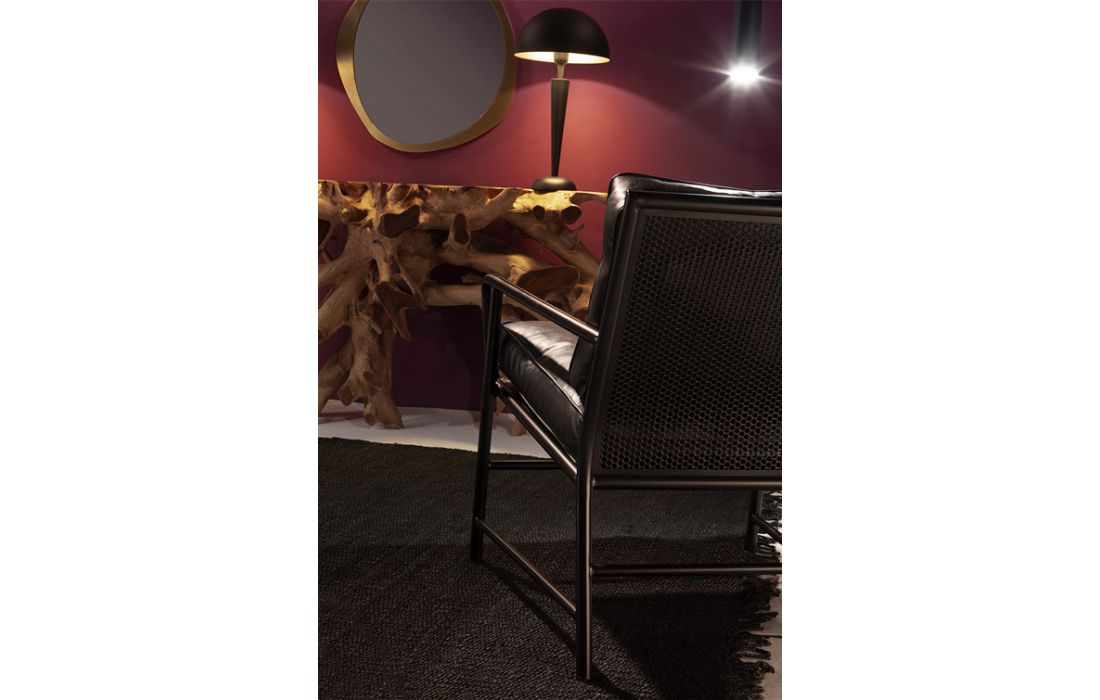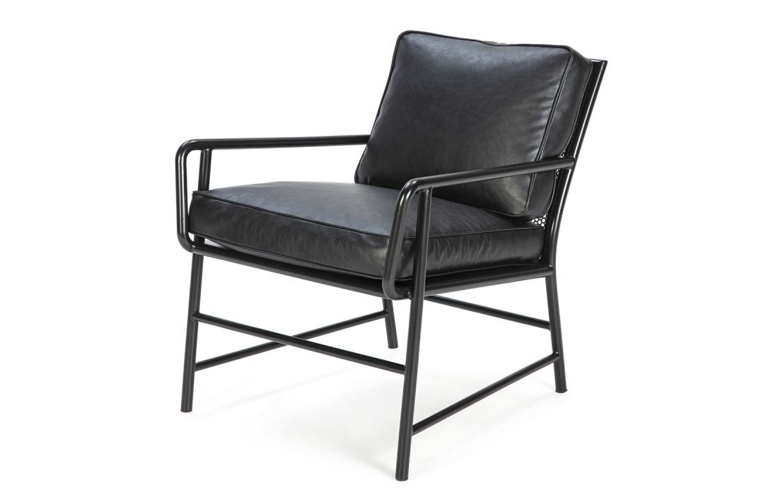 Armchair with dark gray metal structure and upholstered in black leather