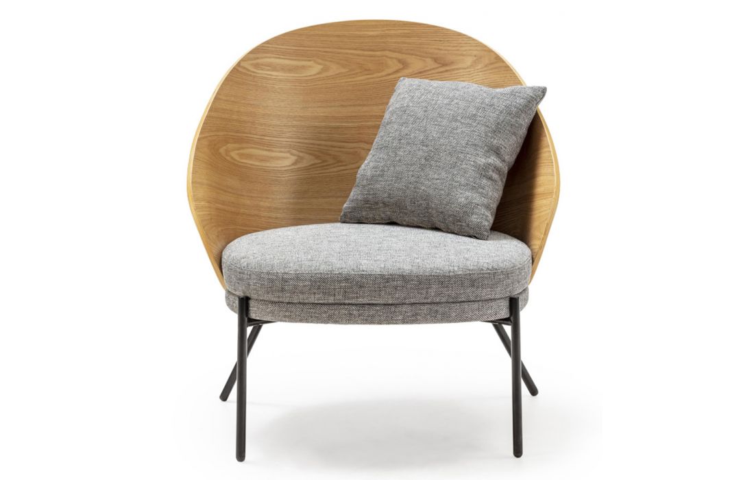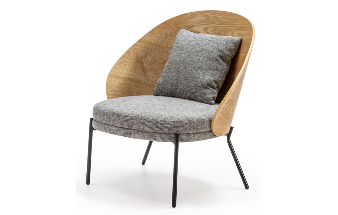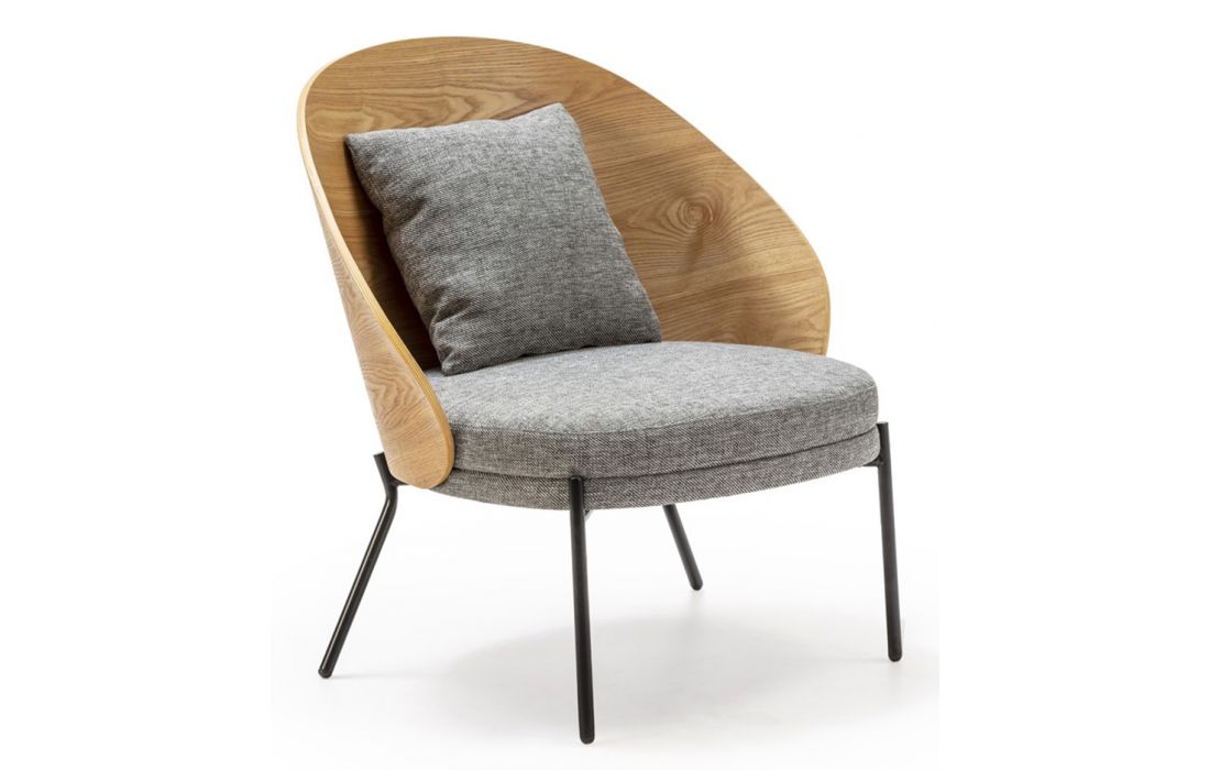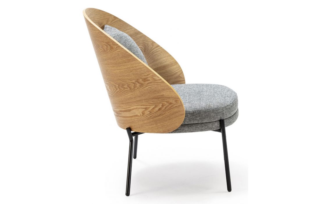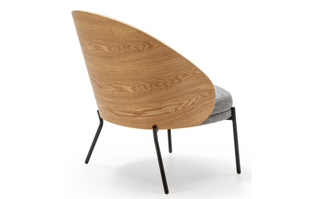 Armchair with black metal legs, back in natural beech wood and seat upholstered in gray fabric
