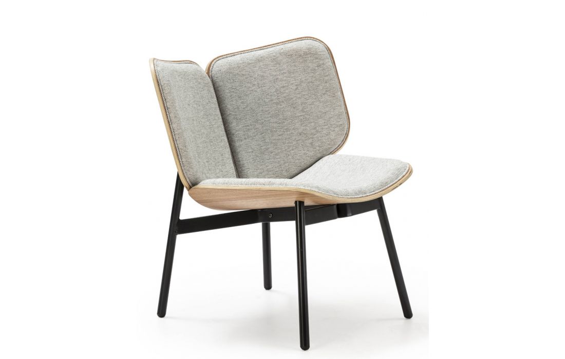 Armchair with black metal structure, seat and back in natural beech wood and gray fabric