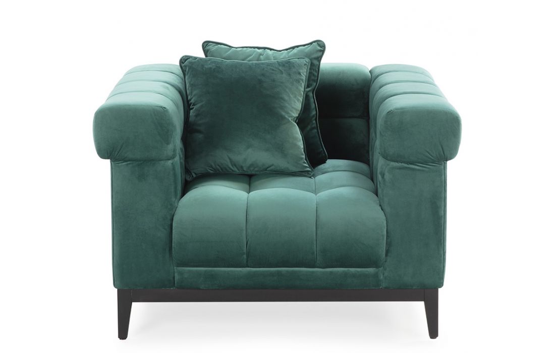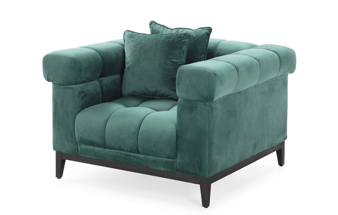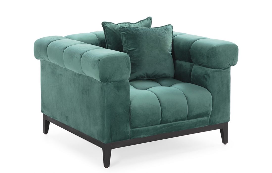 Armchair with upholstery in velvety 100% polyester green fabric and wooden base