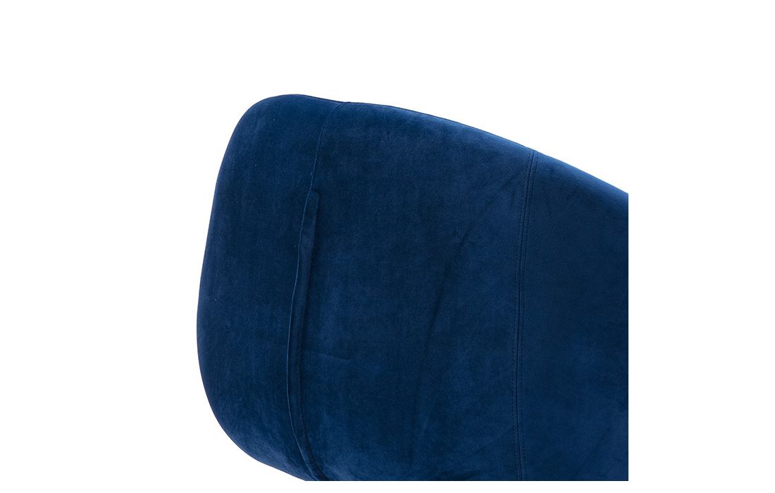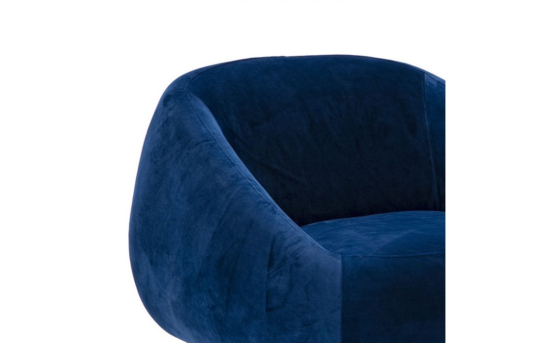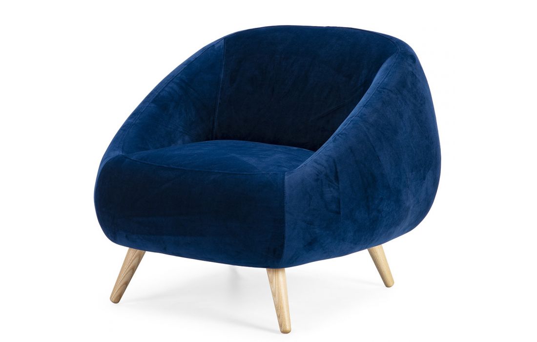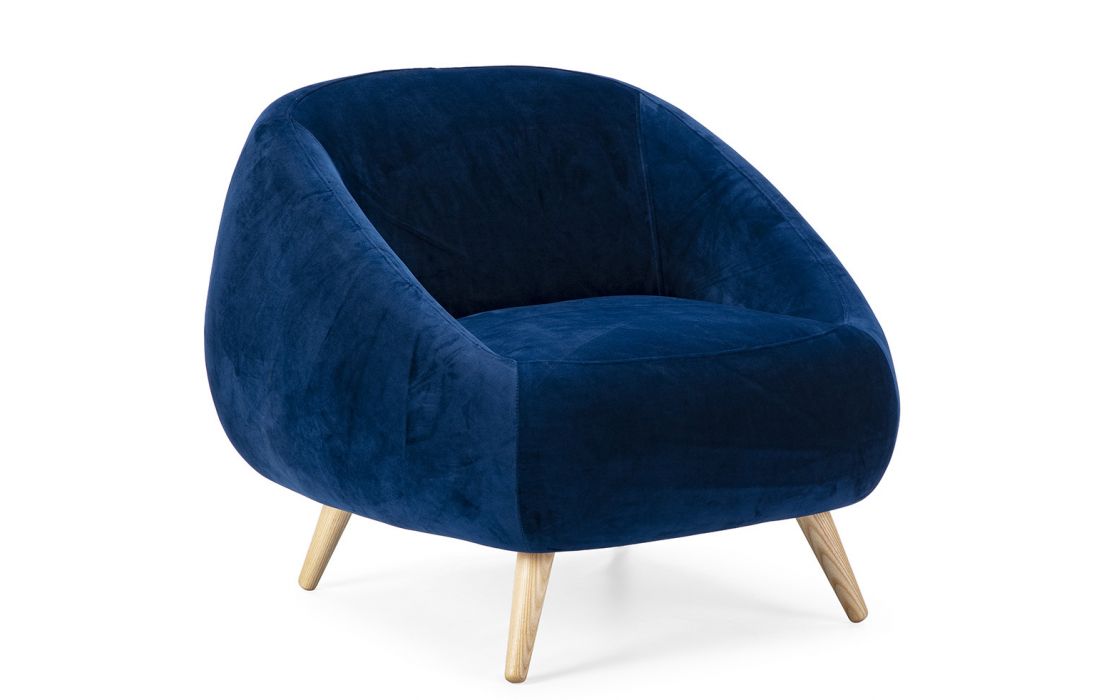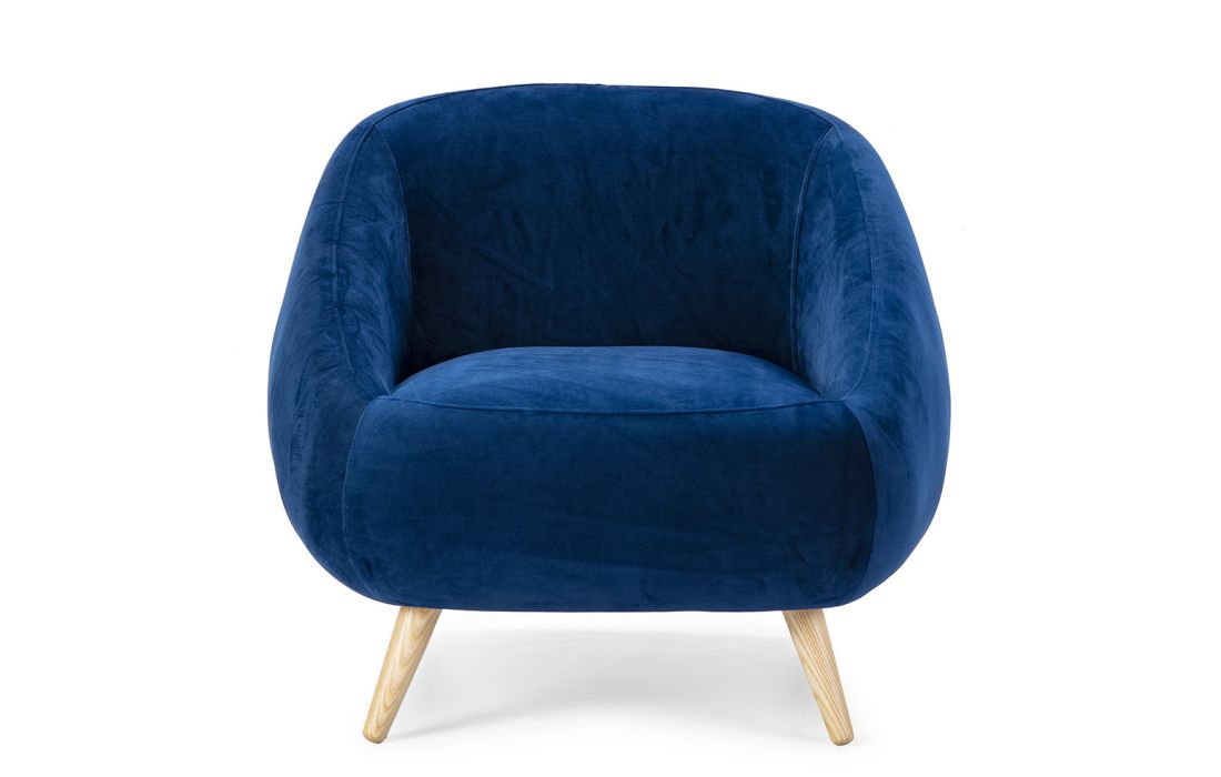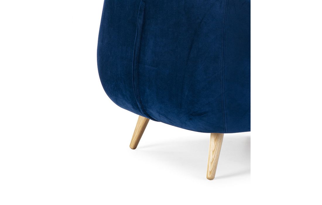Armchair with blue velvety fabric upholstery and natural colored wooden legs