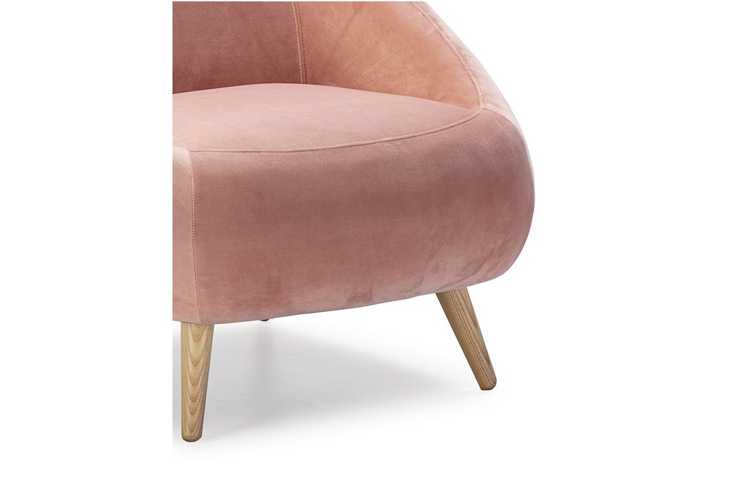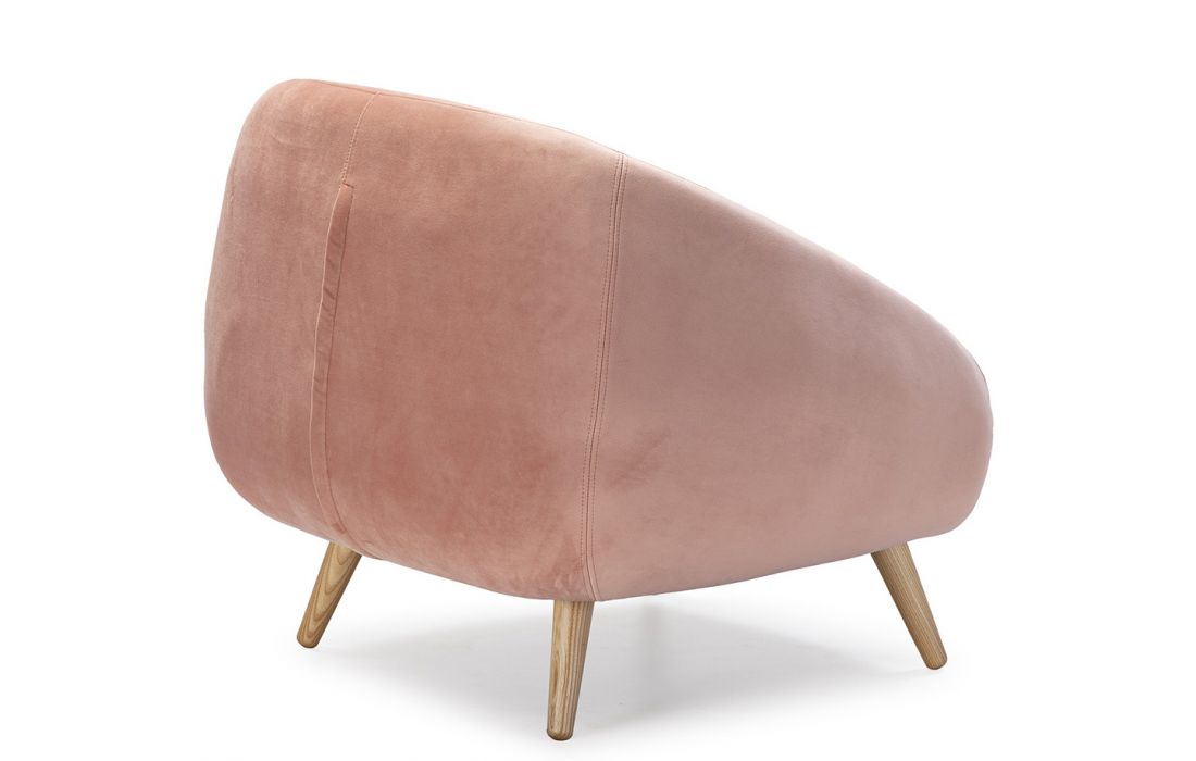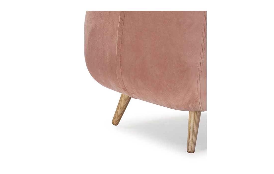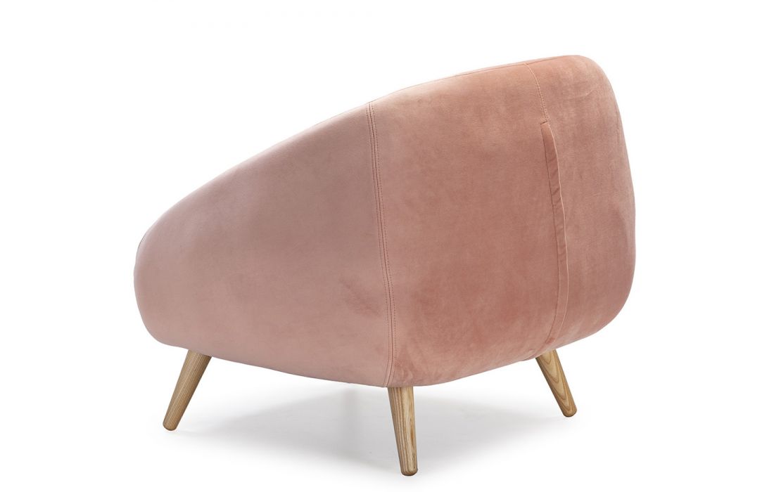 Armchair with pink velvety fabric upholstery and natural colored wooden legs