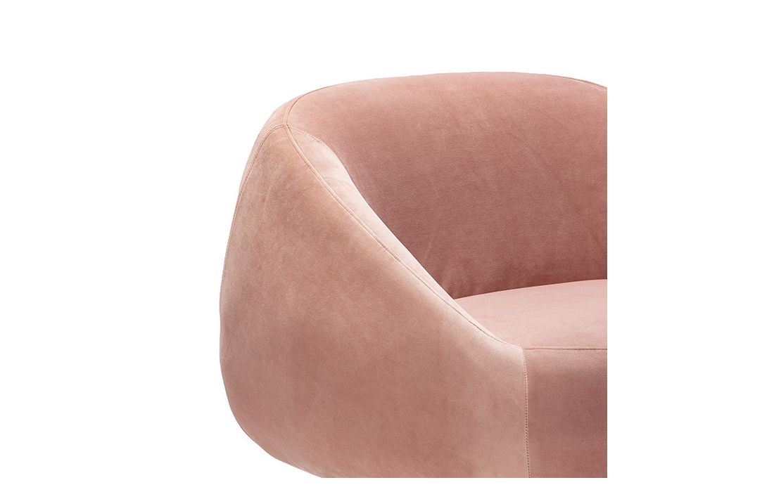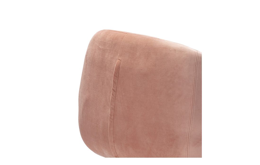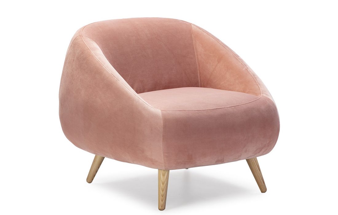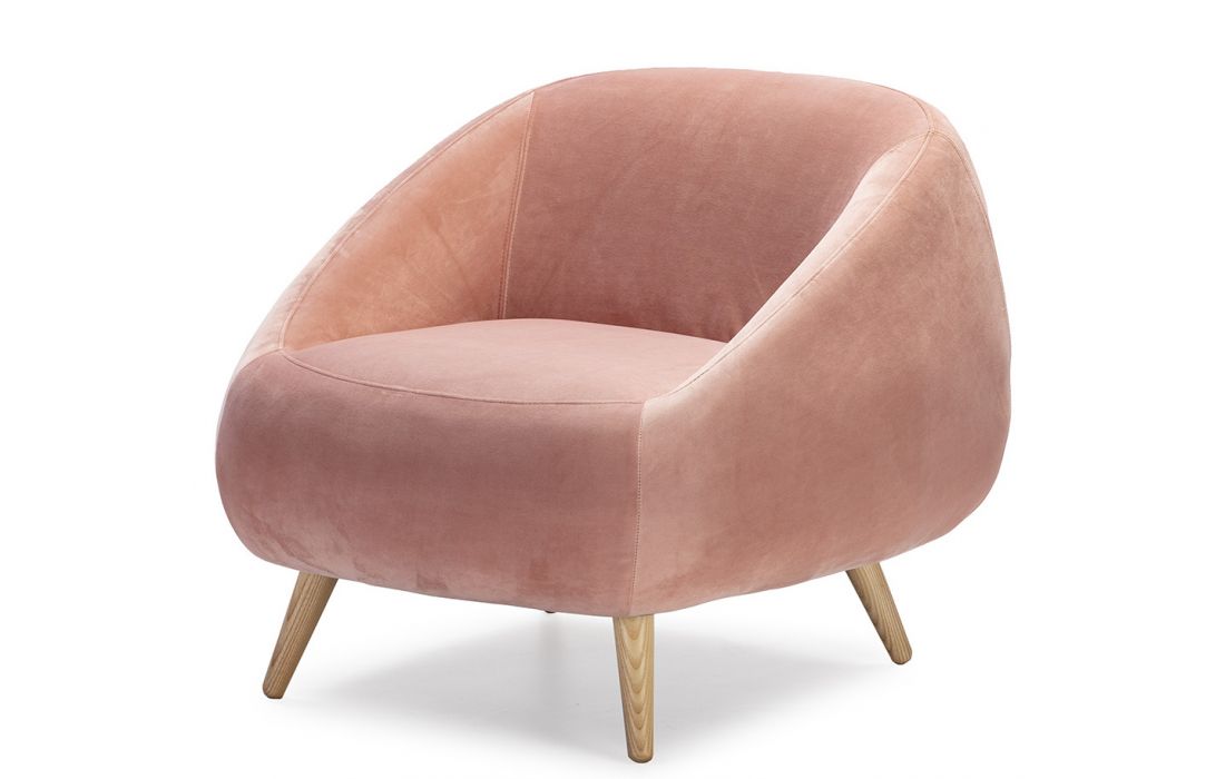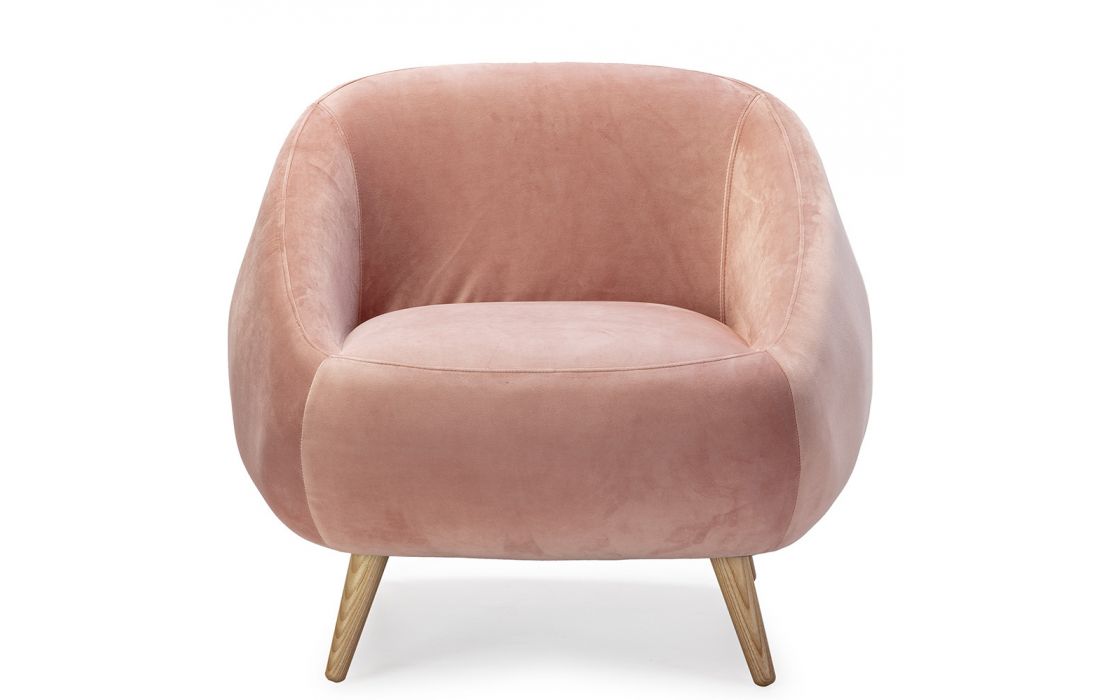 Armchair with pink velvety fabric upholstery and natural colored wooden legs