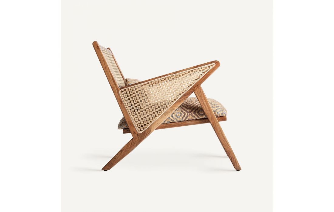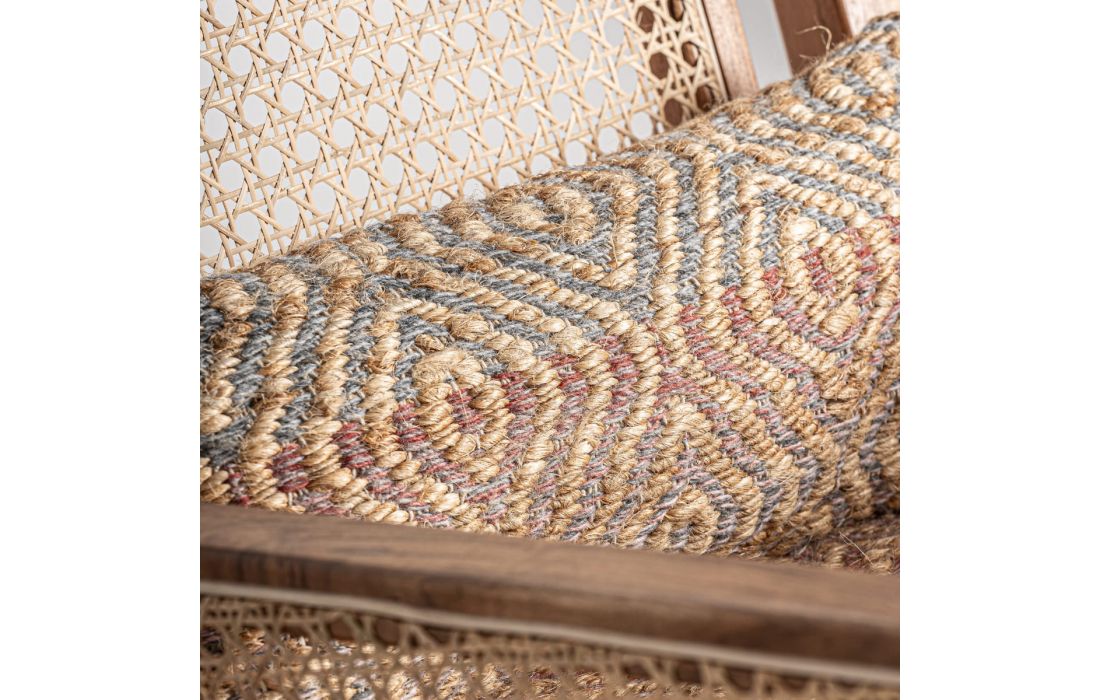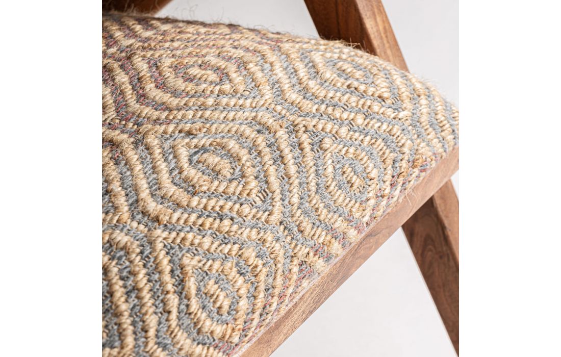 Wooden armchair with fabric and jute upholstery.