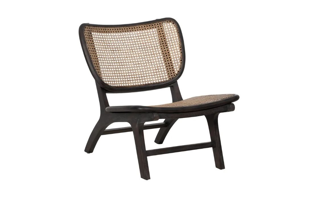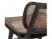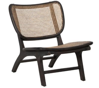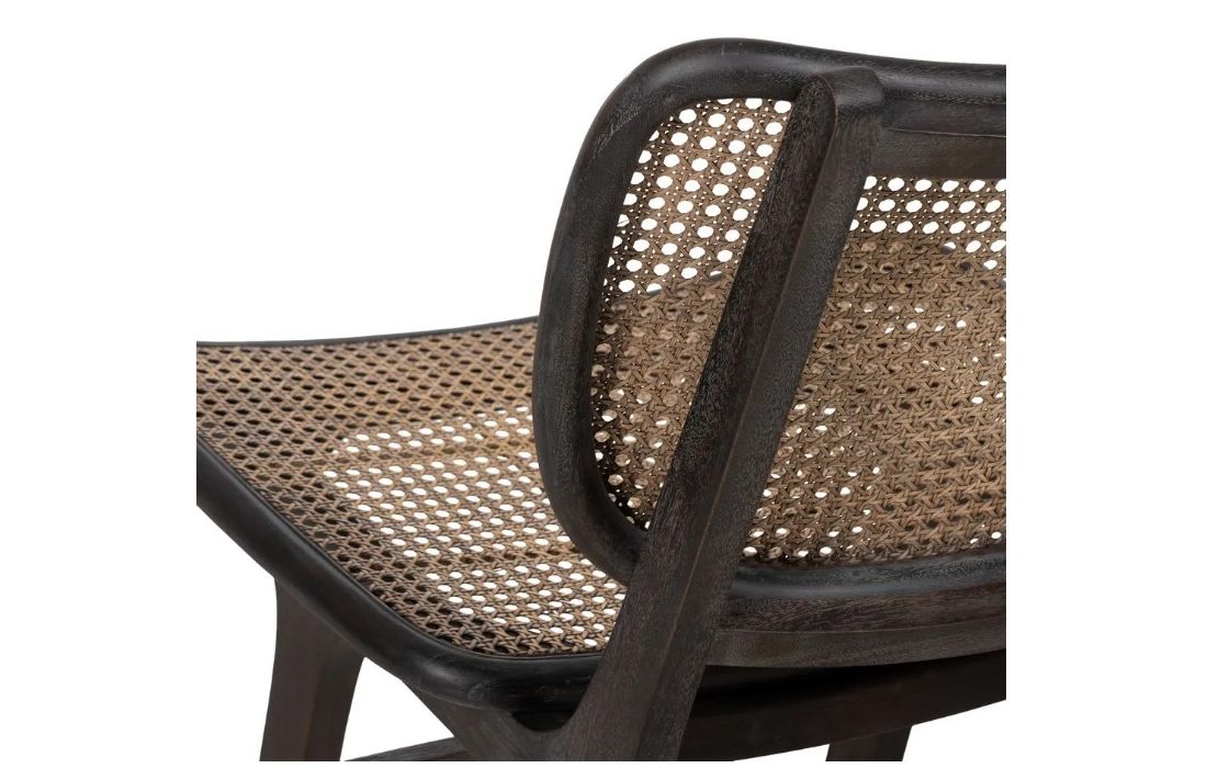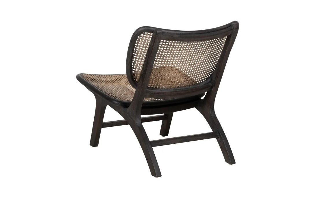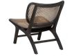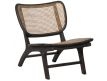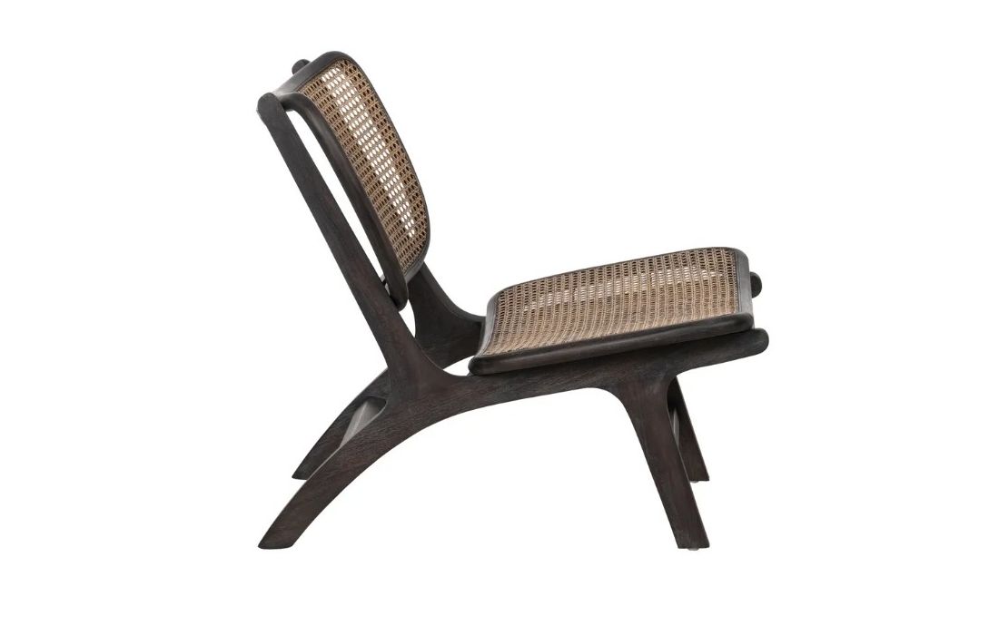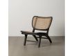 Modern design armchair with mahogany wood structure with rattan seat details.