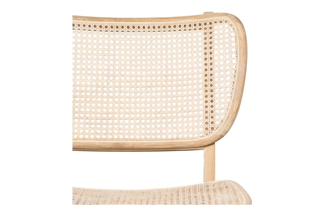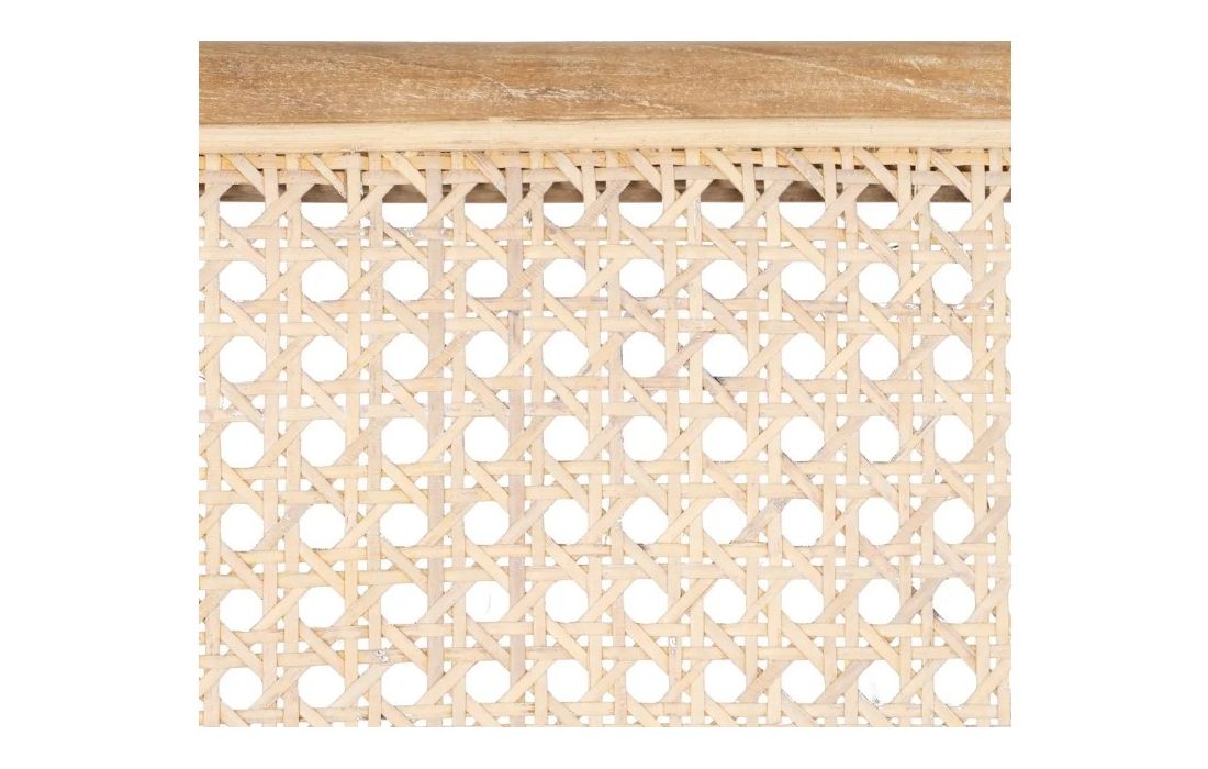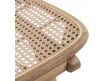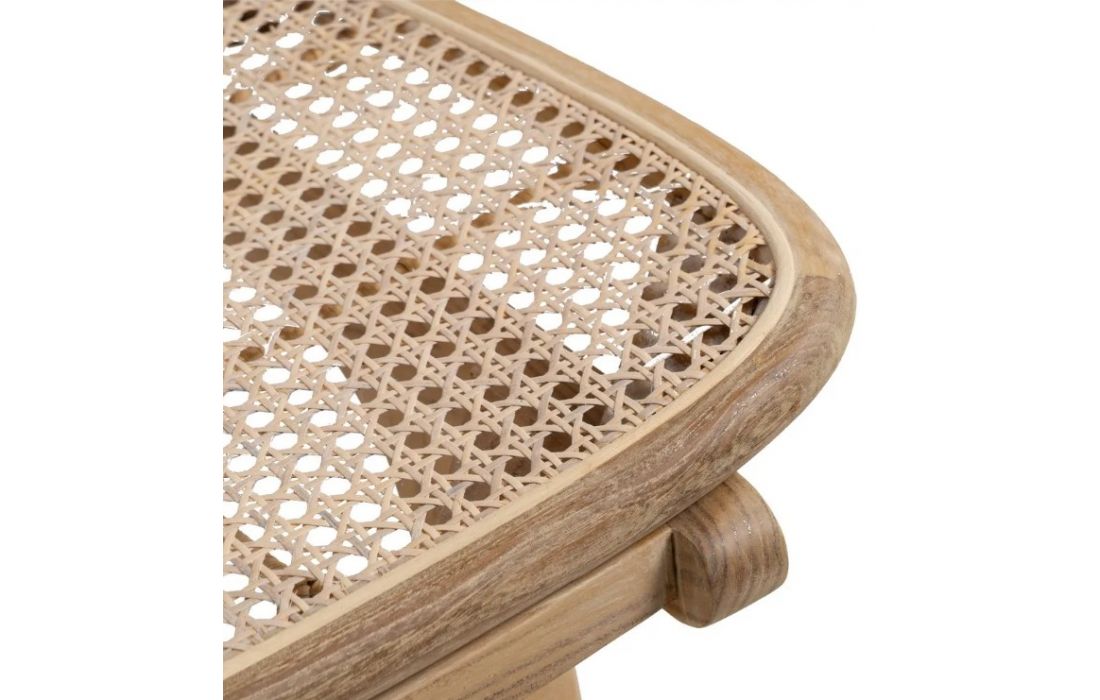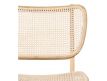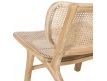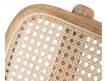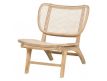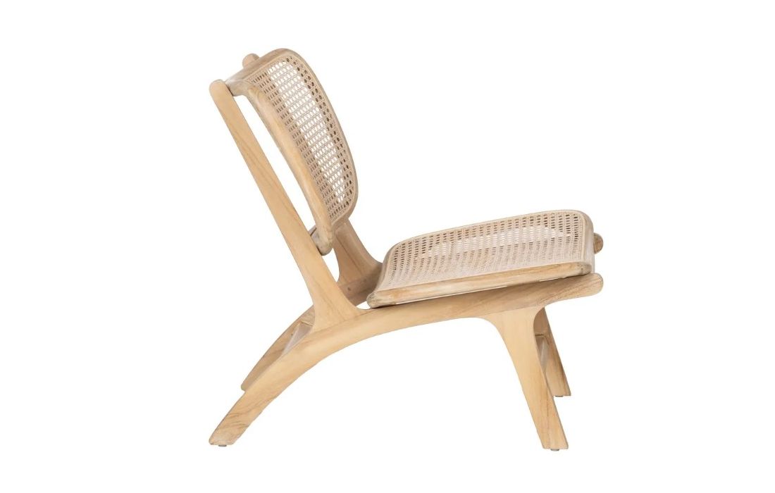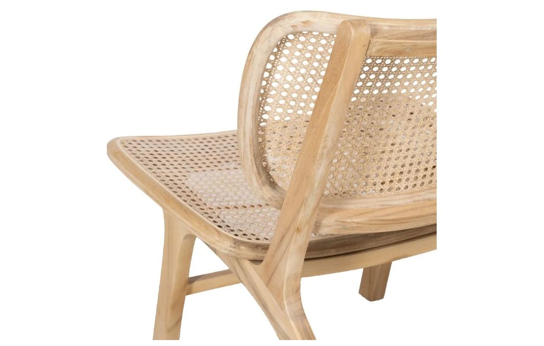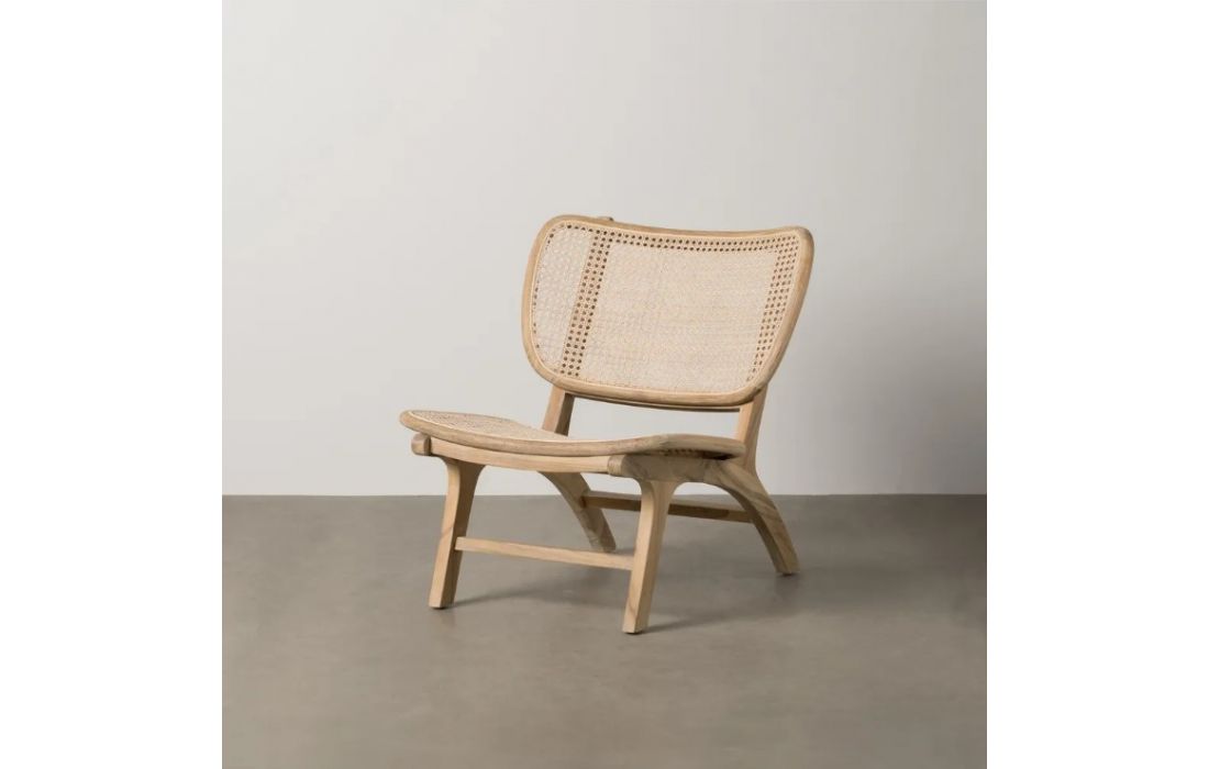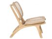 Modern design armchair with teak wood structure and rattan seat.