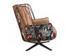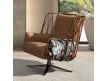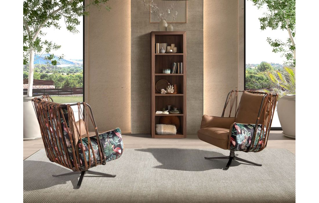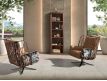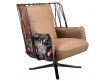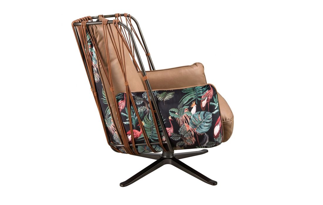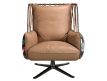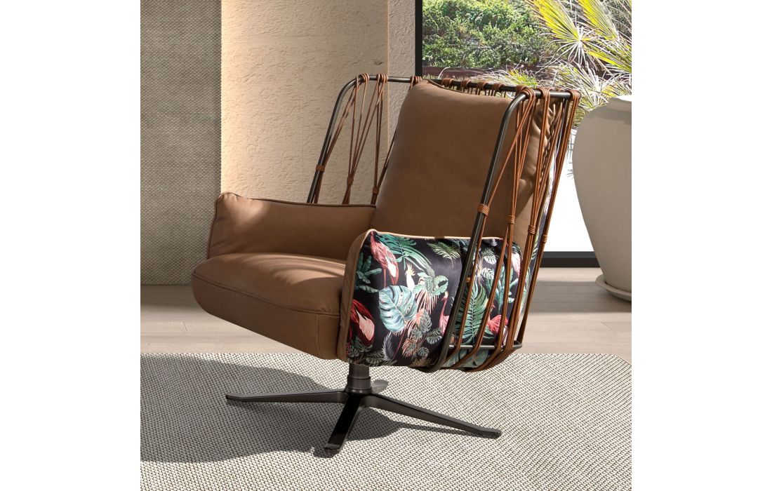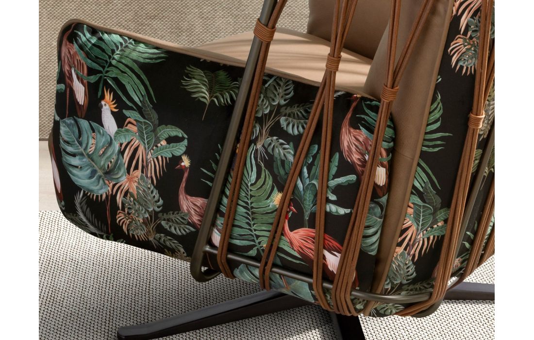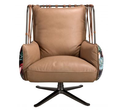 Modern design swivel armchair with armrests, leather upholstered seat and fabric upholstered backrest, and stainless steel legsRecipient :